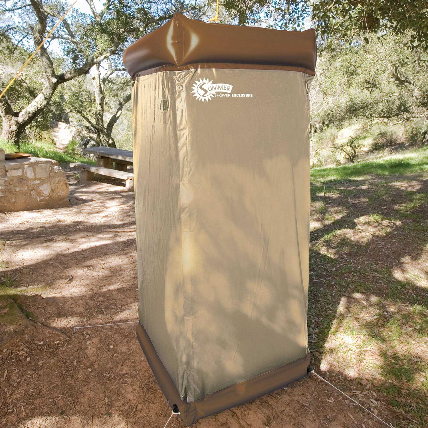 Advanced Elements Summer Shower Changing Toilet Enclosure – Tan/Silver Advanced Elements Private Shower Enclosure Made by Advanced Elements, this shower enclosure gives you privacy when you’re using a camping shower in the great outdoors. It’s great for camping, fishing, hiking, or other similar outings. The enclosure offers side-entry access and features air chambers on the top and bottom and a see-through port hole. Included are tie-down stakes that enable you to secure the enclosure to the ground.