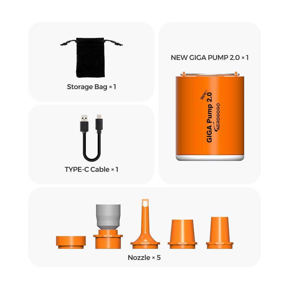 Compact and Portable New GIGA PUMP 2.0 is the most compact pump in the world, it weighs only 2.9 ounces, as small as a key, with its ultra-compact design of air Pump, vacuum pump and Lantern 3 in 1, It is suitable for most of the context in your outdoor or household life. Small but Powerful Powered by a rechargeable 1600mAh lithium-ion battery, that GIGA Pump 2.0 is 1300mAh, one charge lasts long enough to fast inflate more than 10 single air mattresses, or vacuum more than 20 large vacuum bags, or last up to 10 hours of illumination. 5 nozzles It comes with 4 different nozzles to fit most air mattresses, inflatable pool floats, swimming rings, yoga ball and kid’s toys. 1 nozzle for vacuum bag to save you more than 50% of space. Save Your Space and Time It could work with vacuum bags to store spare comforter and out of season clothes. With the vacuum nozzle, it will suck up all the excess air within the vacuum bag quickly. Save you more than 50% space. Camping Lantern New GIGA Pump 2.0 comes with an ultra-bright lantern with a brightness of 40lm to 400lms. New GIGA Pump 2.0 provides you more convenience both in your outdoor and daily life.