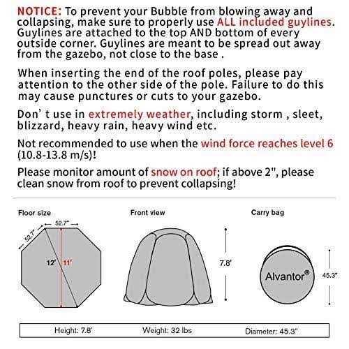 Brand: Alvantor Color: Beige Features: HI-LIGHTS: This Winter Screen House is 12’x12’x8’H, 32 lbs, innovated frame and folding method into a compact carry bag with 45.3″ diameter. Automatic pop-up, no assembly need, featuring stable, durable. Get back to normal activities while practicing social distancing.Perfect for setting boundaries between you and others for personal and business use , like restaurants, salons, etc. NOTICE, please monitor amount of snow on roof; if above 2″, please clean snow from roof to prevent collapsing! SPACIOUS & WARM: Alvantor Big Bubble Gazebo providing a spacious interior shelter that comfortably fits 8-10 adults, huge interior space for patio furniture. 8 panel super transparent PVC, allows a clear, 360°view. Featuring excellent warmth retention, wind-resistant. PVC allows for a warm and relaxing outdoor space for you and your family. NOTICE. This Bubble Tent is snow proof up to 2 inches, but leak when wet. It has a waterproof attachment top cover to be purchased separately. PATENT DESIGN: Two windows on the top provide ventilation while extra 2 top covers protect you from rain & snow. Two large entrance doors with double side silicone zippers, allow easy sccess from the inside and outside. Detachable support poles on the top to prevent collapsing in rainy days. Convenient extra hooks for your coat, bag or other items. For extra stability win the wind, 8 elongated sandbags, 16 guylines and 16 mounting stakes. POP UP & EASY FOLD DOWN: Innovative fiberglass ribs pop up in a second, no assembly needed. Upgraded plastic cover reinforces strength & sturdiness of the frame. Patented folding technique is easy to fold down & carry. Bag diameter 45.3″x4.7″H. Best transparent room to enjoy garden, backyards, travel, parties, afternoon tea, picnics or meetings. 100% SATISFACION GUARANTEE Package Dimensions: 31.7 x 31.4 x 5.5 inches