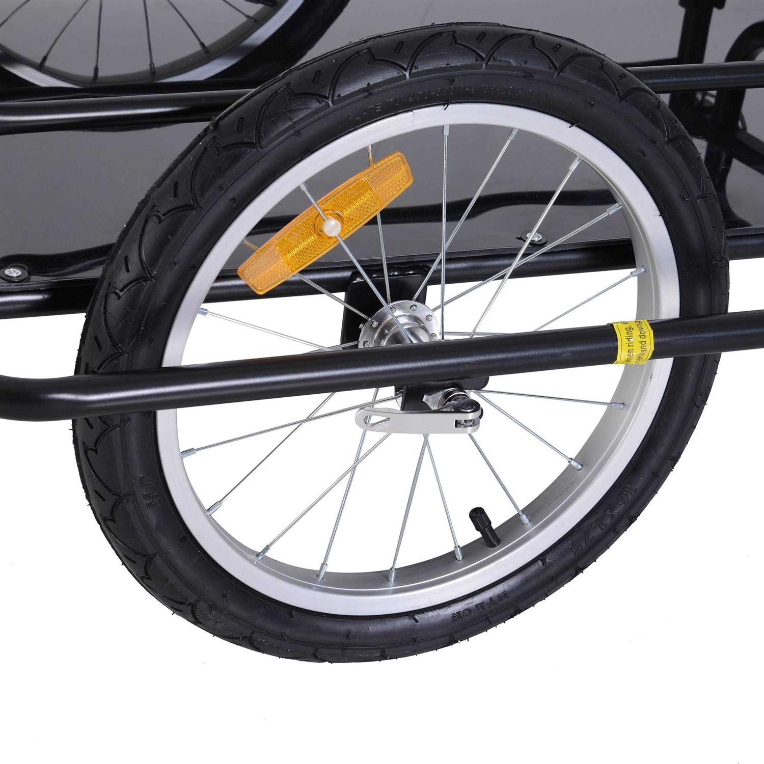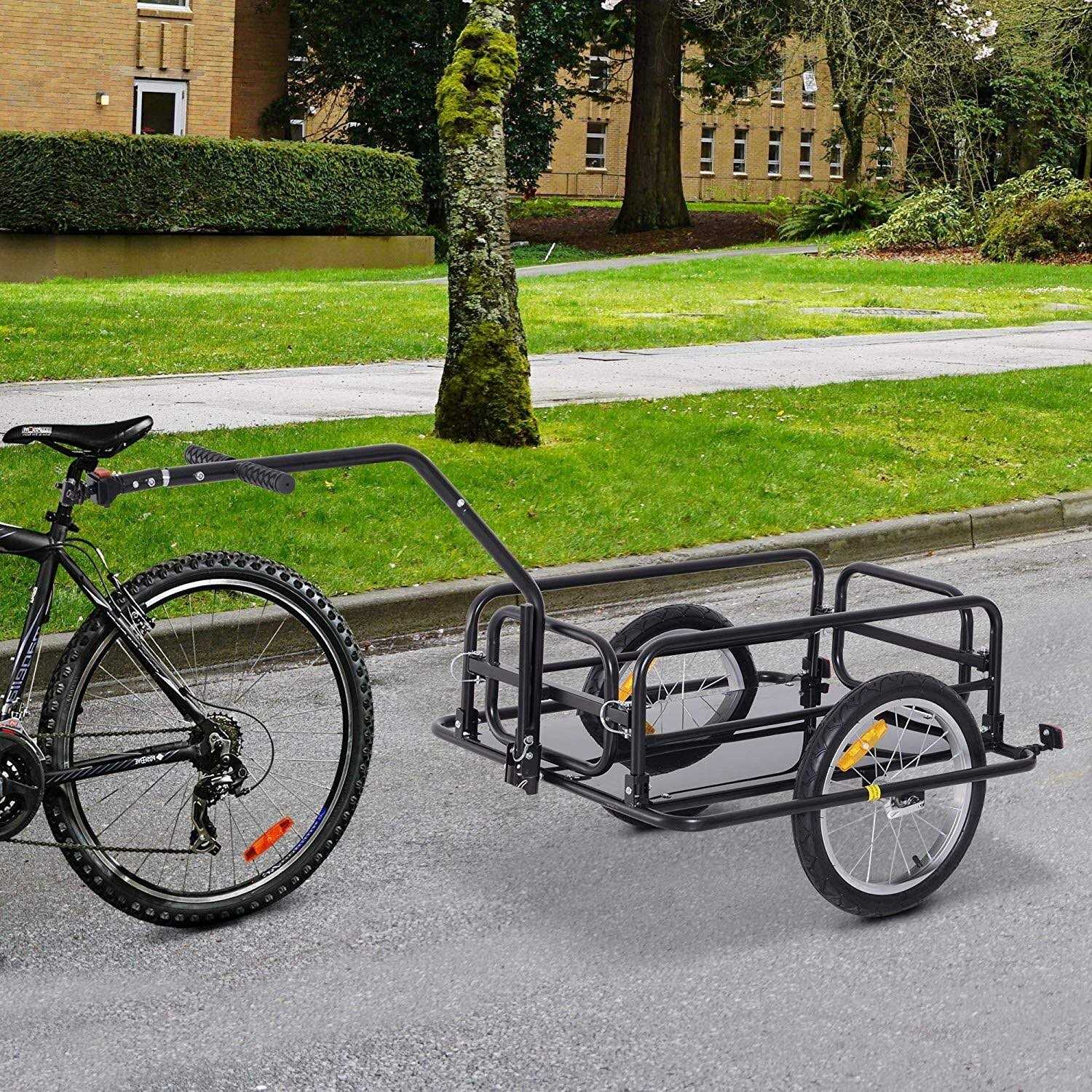 Our newest model of cargo trailer from Aosom attaches to most bicycles or electric scooters and has plenty of space for groceries and running routine errands. Steel frame construction allows a weight of up to 80 lbs. to be carried with ease. 2 16″ air-filled wheels offering added stability and a smoother ride with your cargo load. Best of all, it’s super easy to attach with the included seat post bicycle hitch. Features: – Durable steel frame construction holding weights up to 80 lbs. – Large, air-filled 16″ tires for increase hauling and load capacity – Specially strengthened steel bar provides exceptional balance and steadiness – Folding design to assemble and disassemble easily – 2 reflectors on the wheels for safety consideration – Seat post hitch for quick and easy attachment to bicycle – Can fit most bicycles or electric scooters – Quick release wheel Specifications: – Material: Steel, Rubber – Net Weight: 26.5 lbs. – Color: Black – Overall Dimensions: 61.5″ L x 28.5″ W x 32.35″ H – Cargo Area Dimensions: 28″ L x 16.5″ W x 9.75″ H.