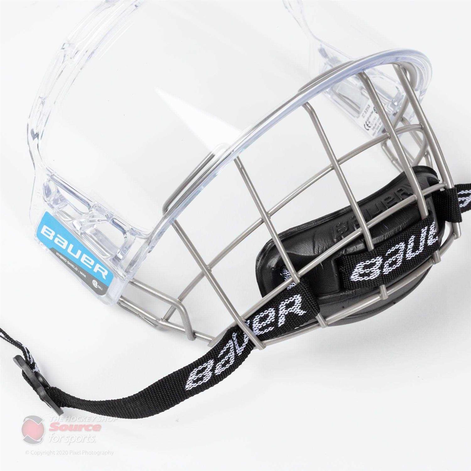The Bauer Hybrid Hockey Helmet Shield is a great choice for the player who wants the visibility of a shield with the breathability of a cage. The Hybrid Shield features a tough Polycarbonate construction, utilizing an anti-fog interior coating and an anti-scratch exterior coating. The cage is constructed of a strong, oval-wire frame design that is optimized for breathability and visibility. It is also designed to fit on all Bauer masks and most others. A dual density chin cup offers protection and comfort and floats independently of the cage to sit tight to your chin at all times. The chin cup also has built-in moisture channels to keep you feeling dry. Compatibility: Compatible with most certified hockey helmets and will fit on all Bauer helmets.