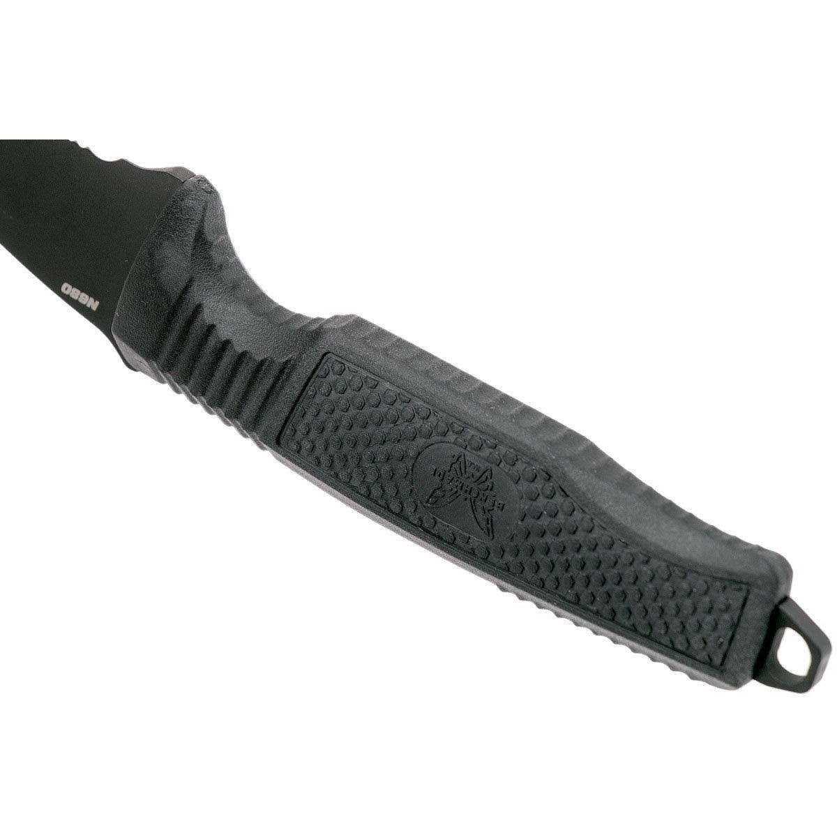 The Benchmade 112 H2O Fixed Blade dive knife was originally developed for an elite military program. A fixed black-coated blade with blunt tip and integrated rescue hook, this knife features N680 ultra stainless steel, a special application steel for when corrosion resistance is the primary requirement. Ideal for salt water applications, the addition of nitrogen to the alloy gives this the best corrosion resistance of any blade steel, with edge retention between 420HC and 440C. Textured Santoprene handles for comfortable and reliable grip, and a molded thermoplastic sheath with thumb release.