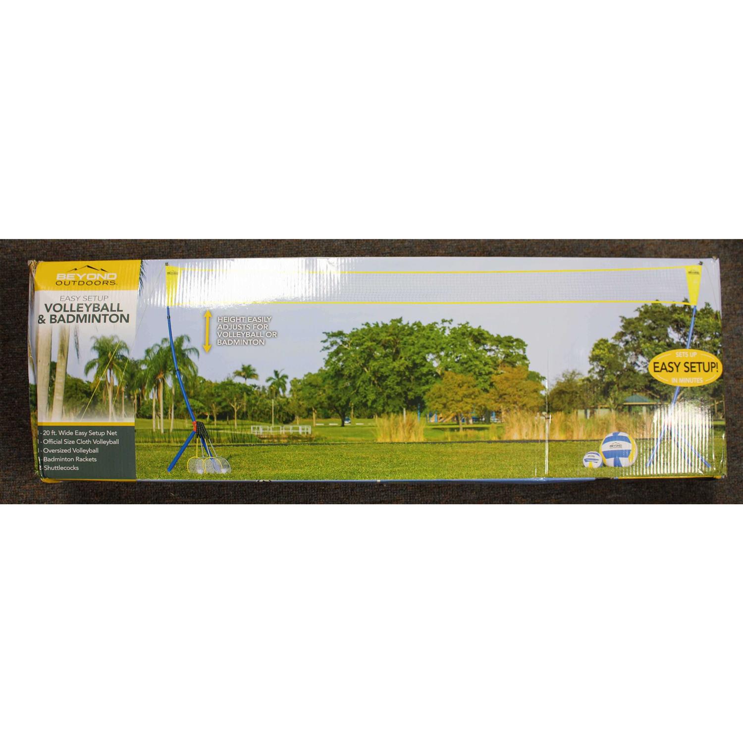 Bring double the fun to your next party with the Beyond Outdoors Easy Setup Volleyball Badminton Set! Our tripod net system assembles in just minutes and adjusts easily as you transition between volleyball and badminton games. Set it up at the park, the beach or in your own backyard for instant fun that is sure to last. Players of all ages and skill sets can enjoy a day of friendly competition with the Beyond Outdoors East Setup Volleyball Badminton Set!
