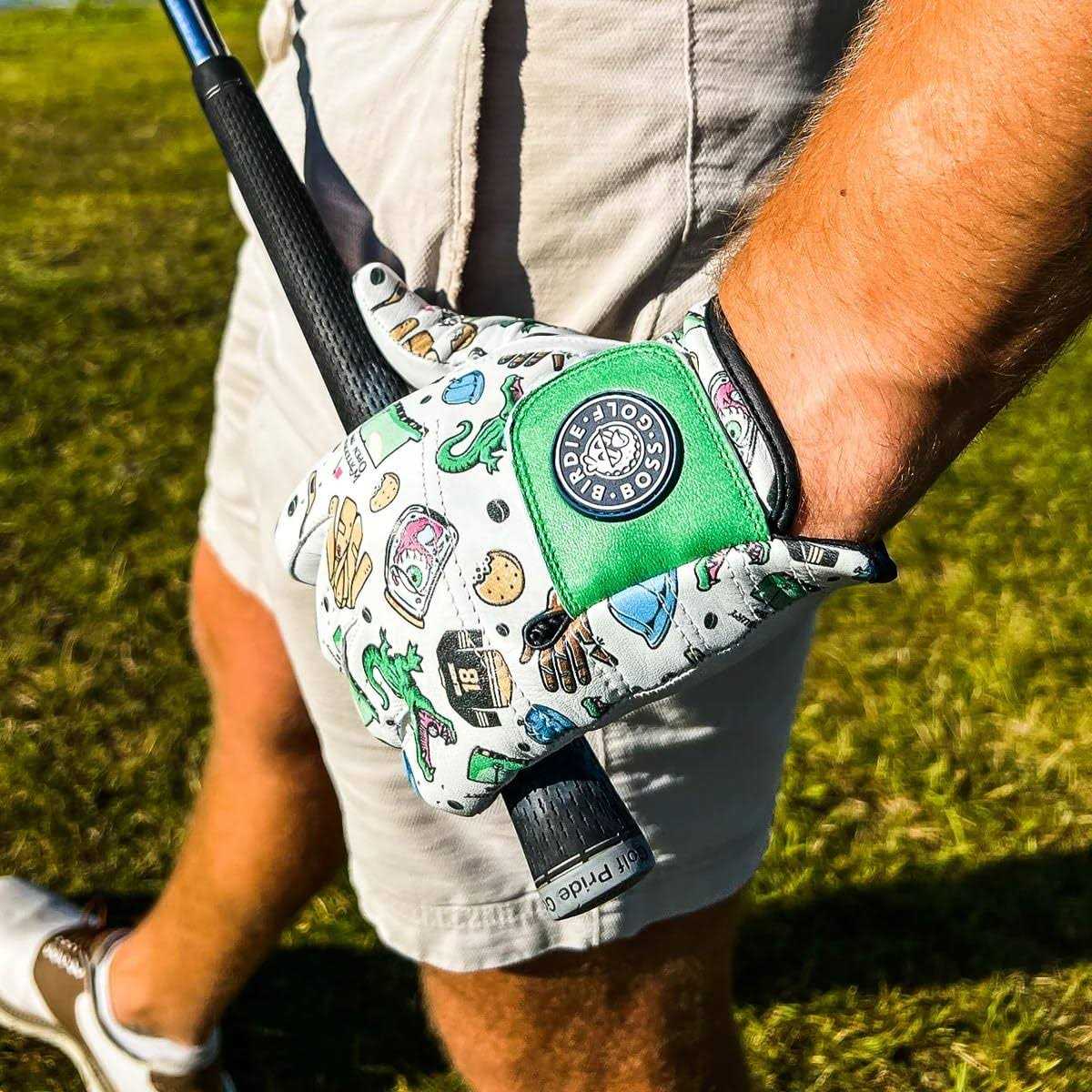 Gloves by BirdieBoss. Details:You’ll feel like you’re barely wearing it, but you’ll know it’s there when you need it. The Gilmore Golf Glove features Cabretta leather for exceptional durability, a Velcro closure for a secure fit and Spandex throughout for flexibility.