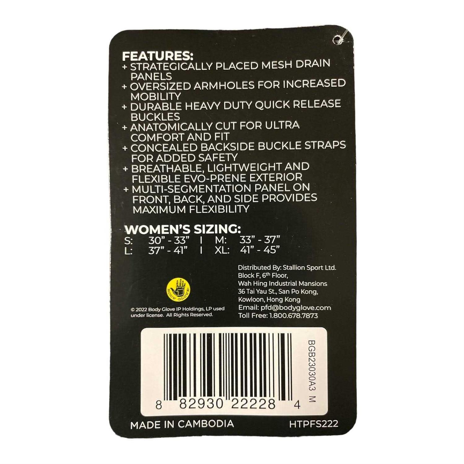 The Body Glove Women’s Segmented PFD offers a lightweight, durable, yet flexible fit that does not hinder the users action while wakeboarding or riding on a PWC. A multi-panel design with oversized armholes will increase the range of motion, which provides increased mobility and comfort. An updated inner liner allows for more airflow throughout the vest, allowing it to dry quickly while giving you a more comfortable fit. The Body Glove Women’s Segmented PFD is the essential vest for your water sports needs.Features & DetailsThis PFD features strategically-placed mesh drain panels. Oversized armholes add increased mobility while durable heavy-duty quick-release buckles make it easy to get the vest off fast when needed. Anatomically cut for ultra comfort and fit, this PFD is designed for a woman’s figure. The multi-segmentation panel on front, back, and side provides maximum flexibility. Made of breathable, lightweight and flexible EVO-PRENE exterior, concealed backside buckle straps add extra safety.