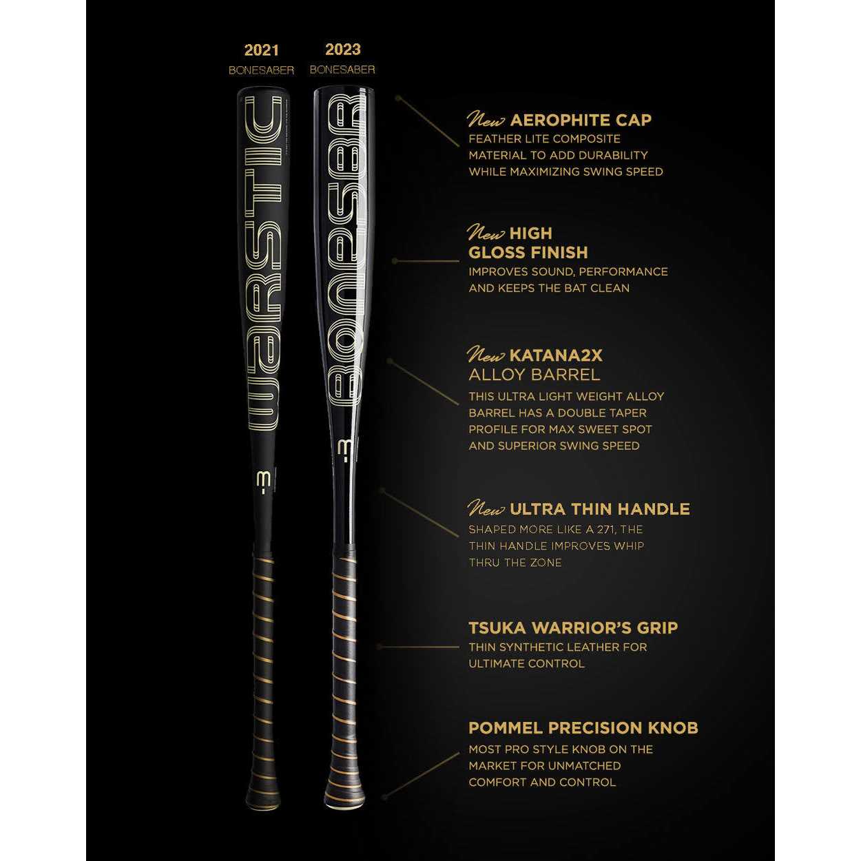 Katana2X Alloy Barrel constructed of ultra light weight premium alloy with a double taper barrel shape to maximize sweet spot and increase whip thru the zone Patented Pommel Precision Knob is the most pro style knob on the market for unmatched comfort and control Tsuka Warrior’s Grip is an ultra-thin synthetic leather providing ultimate control Aerophite Cap is built with a feather lite composite material to add durability while maximizing swing speed Bonesaber is a ‘Speed Loaded’ One Piece, built for speed without sacrificing power output Features a gloss barrel with a matte Wartip Barrel is 2 ⅝” It’s lonely in the box…out there it is 1 V 1. Who will be the last man standing? When you’re facing devastating heat, there is no time to think. The only chance you have is hunt the fastball. The all new Bonesaber is built to face the most feared pitchers in the game. The Katana2X Alloy Barrel is constructed of our highest grade ultra light alloy and features a state-of-the-art double taper with thinner handle that increases swing speed and whip thru the zone, improves feel and maximizes sweet spot. The new Bonesaber is now more balanced and capable of producing superior swing speed and incredible exit velocity. The combination of our patented Pommel Precision Knob paired with one piece construction will give you unmatched comfort and bat control for the most responsive bat in the game.
