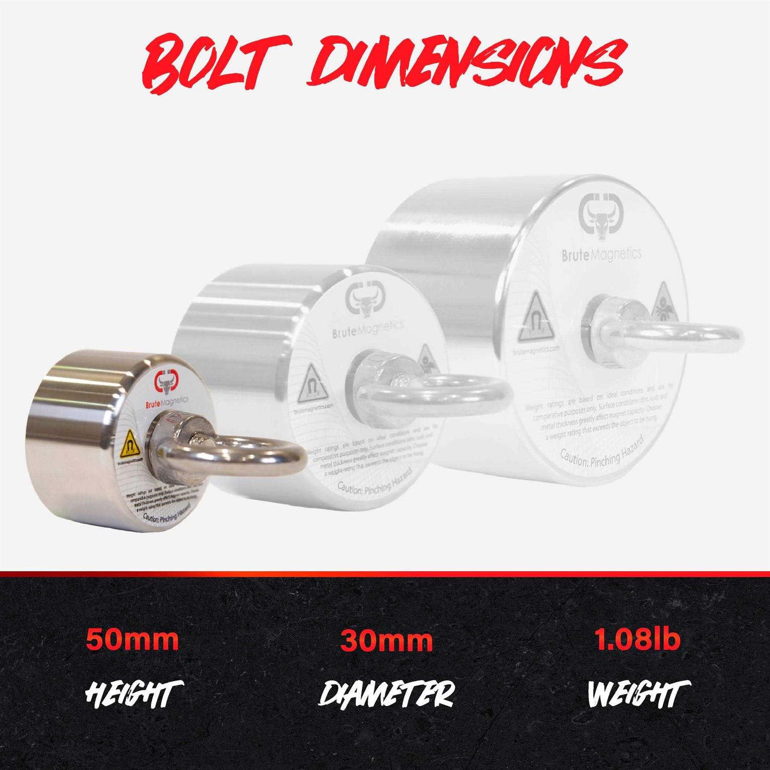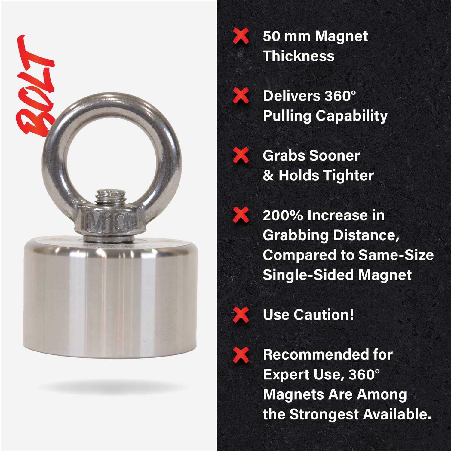 Lift Magnets by Brute Magnetics. Details:Meet the Bolt. A powerful, innovative magnet with a significant 360 degrees of magnetic attraction and a pull force of 800 pounds. The Bolt is designed for entry-level use and is perfect for little fishers. All 360 magnets bundles come with threadlocker, rope, cut-resistant gloves, and steel carabiner to ensure you have all of the necessities for a day of magnet fishing. Magnet fish with confidence at every level.