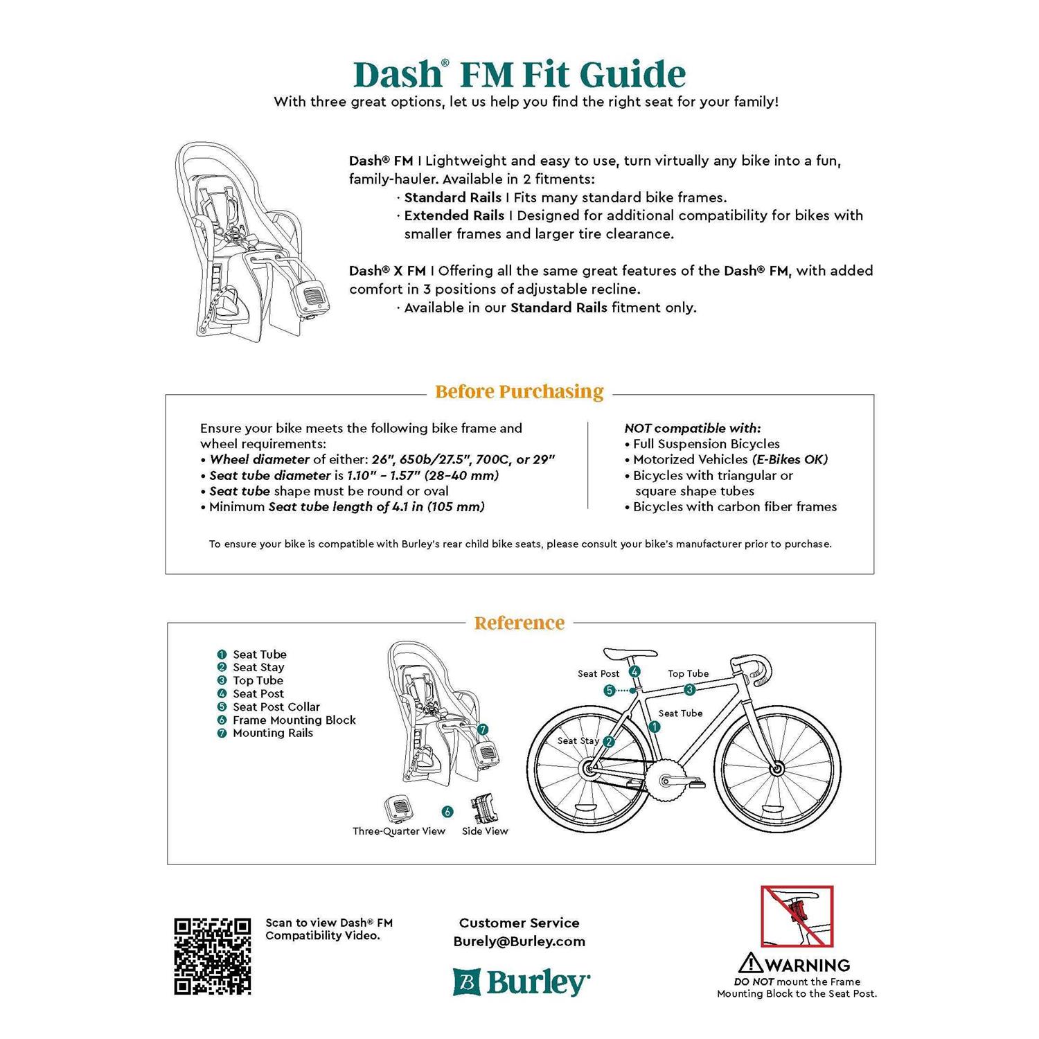Burley Dash Frame Mount Child Seat w/ Extended Rails