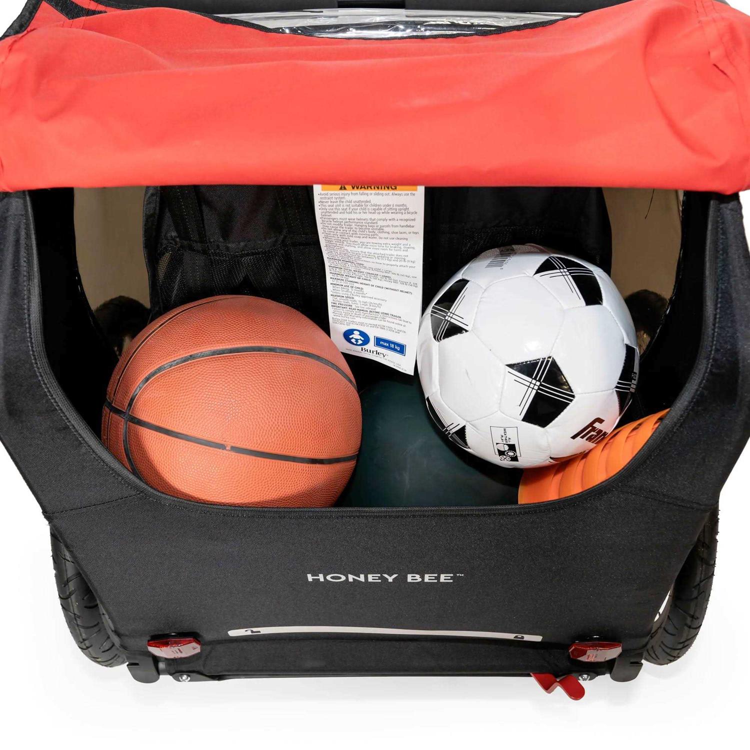 For a seamless solution to biking and strolling on the go, the Honey Bee easily converts from a lightweight, two-seat bike trailer to a convenient walking stroller. With all the great features on the bike-only Bee trailer, the Honey Bee also features a 1-Wheel Stroller Kit so you can switch from biking to strolling without unloading the kiddos. Adjustable ergonomic handlebar that doubles as an additional roll bar when folded forward for bike mode. Compact fold flattens trailer for easy storage and transportation. Tinted side and rear windows. Rear window ventilation. 20″ push button wheels. Hub engaged parking brake. Five-point harness system. Flex connector allows bike to lay flate while trailer remains upright. 55% of all softgoods in Burley kid and pet trailers are made from postconsumer recycled materials.