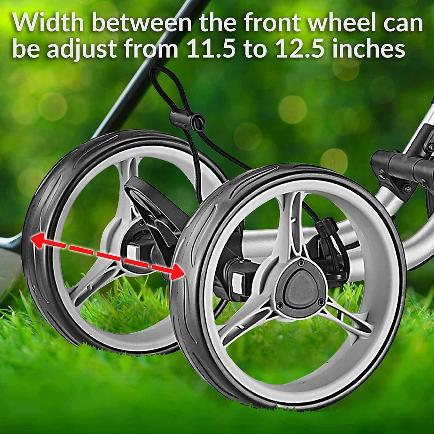 - Width between the two front wheel can be adjust between 11.5 to 12.5 inches to fit any size of golf bag and add the moving stability