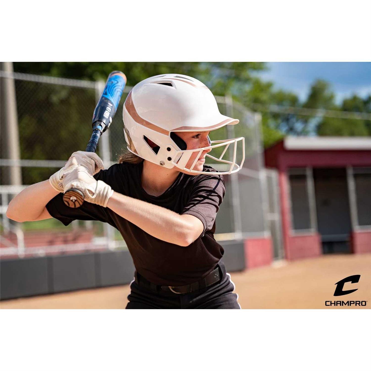 EXCLUSIVE DESIGN: A CHAMPRO exclusive design, the Rise Pro youth and womens softball batting helmet gives you premium softball gear for girls that maximizes airflow and visibility. Vent holes release heat so hitters can keep a cool head at the plate. DURABLE: Our girls adult batting helmet has a durable ABS shell to withstand impacts, and meets NOCSAE standard for all levels of play. Champro is leading the way in on-field safety with our baseball & softball batting helmets. COMFORT: Our White/Rosegold softball helmet with face mask for girls have a weight-optimized shell lined with impact foam, and jaw pads wrapped in soft-touch fabric to provide excellent protection and comfort. Pads are wrapped in mesh to increase comfort and durability. DRI GEAR LINER: The contour-molded DRI-GEAR liner in our adult and youth softball helmet with mask wicks away moisture and helps keep batters comfortable and dry on hot days. LASTING FRESHNESS: A Bio-Fresh treatment provides an extra level of freshness preservation to keep this girls batting helmet fresh game after game. SOFTBALL EQUIPMENT FOR GIRLS: These Champro Rise Pro Junior and Senior Fastpitch Softball Batting Helmets will keep you safe, cool, and composed at home plate. Champro is a leader in adult and youth softball gear because all its products, such as these adult and youth softball helmets for girls, offer quality at a great price. br br Champro is a company committed to delivering next-level girls softball gear and apparel that can rival even the most established brands. Experience it for yourself. br br Features include: br br CHAMPRO exclusive design maximizes airflow and visibility br Weight-optimized shell with impact foam for ideal fit and feel br Mesh-wrapped pads for comfort and durability br BioFresh/DRI-GEAR moisture managing pad liner br Meets NOCSAE standard br All sizes include HXMS facemask br Solid color matte or two-tone color glossy finish