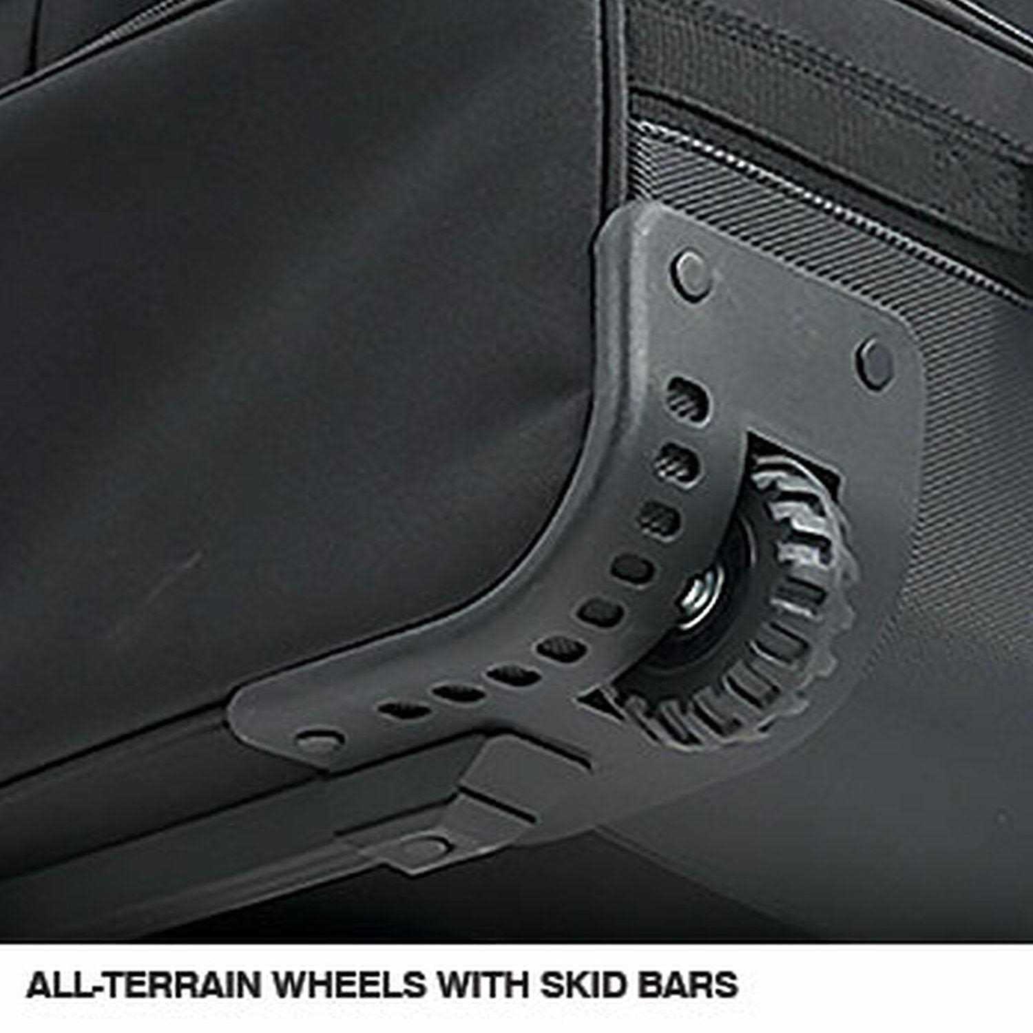 The CHAMPRO Jumbo All-Purpose Bag on Wheels is a multi-purpose athletic bag with plenty of space, smooth movement, and high durability. A U-shaped opening with dual zippers allows for quick access to your gear and the large compartment size holds all your equipment and accessories for many sports, so you can carry all you need for football, basketball, volleyball, soccer, lacrosse, and more. A side pocket provides extra storage space for smaller items, making them easier to find. Easily lift and transport your gear with the wrap-around side handles and flex-grip neoprene front handle, or use the all-terrain wheels with skid bars that provide traction on and off the field to roll your gear around with minimal effort. Made with water-resistant 600D polyester fabric and a polyurethane coating that provides a smooth finish with superior resistance to corrosion and abrasion.