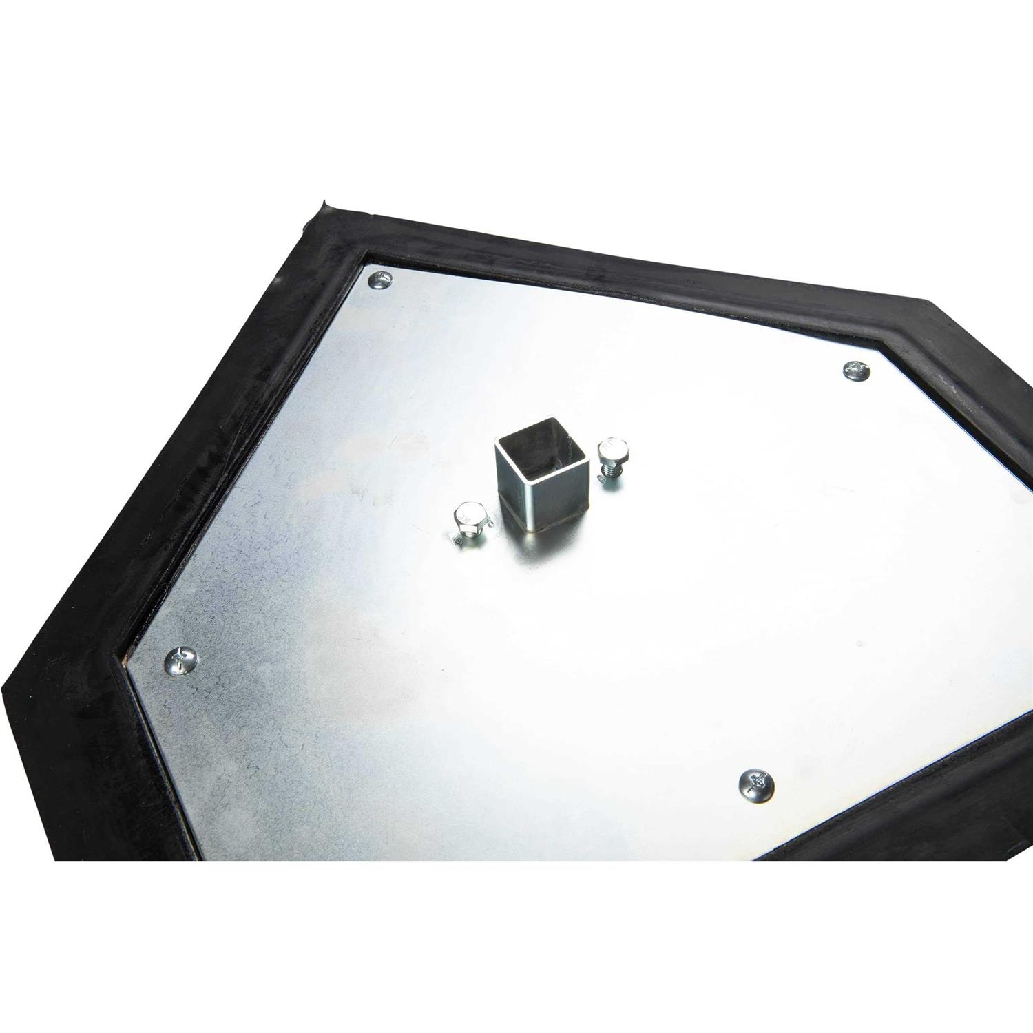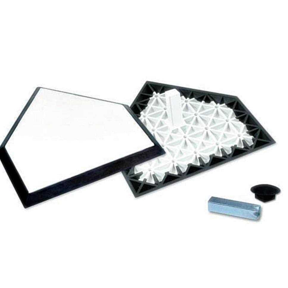 This Champro official size pro-style home plate will round out your base set and have the diamond gameday-ready for any age and skill level, from t-ball to collegiate play and beyond. Made of tough molded rubber with a beveled black border, this plate withstands the traffic of spiked shoes. The nickel-plated stanchion pad and triple-reinforced screw-in steel anchor system resist rusting, allowing this plate to endure all weather conditions. The in-ground anchor system secures the plate, preventing it from being dislodged during play. Comes with all hardware for assembly plus ground anchor and base plug.