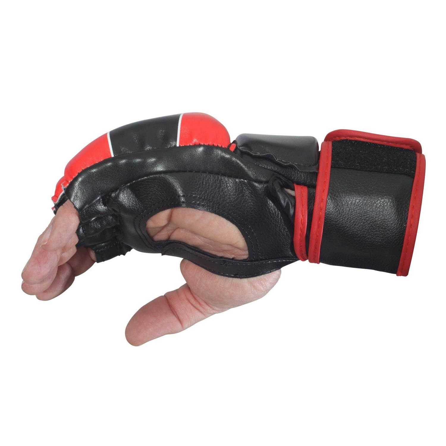 MMA fight gloves meet all state regulations for professional competition, with a five-ounce weight, as mandated by state athletic commissions. Full 3/4-inch padding allows increased safety of the hands and opponent. Open palm allows full gripping capabilities. Synthetic leather construction provides resiliency. Available sizes include YM (5-8 year old), YL (9-12 year Old), Adult S or JR, M, L and XL.