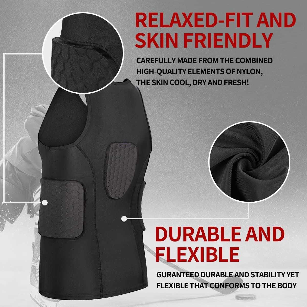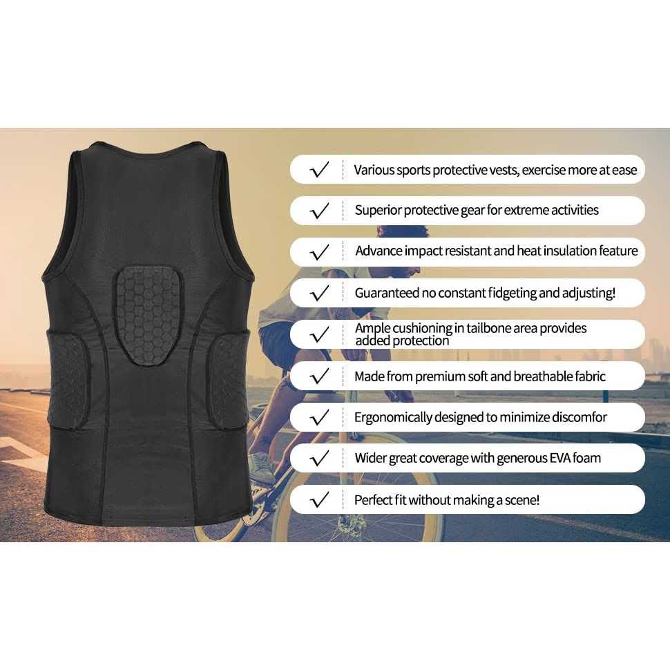 Fit Chest size: M=32-34inch. L=34-36inch. XL=36-38inch. Provides extra support and padding to chest rib and your low back. Padded sport vest, separate EVA pads built into each pad paste from both sides, form a mutual support of one of the EVA pad, effectively slow down and disperse impact Padded compression sportswear designed to protect your body from hurting during contact sports.Perfect for goalkeeper,football,basketball,rugby,baseball,paintball, hockey, baseball, airsoft and all other contact extreme sports Notice: cool wash it gently by hand, hang/lay flat to dry, do not iron, tumble/spin dry or bleach. Sports and physical activities are meant to be fun, but if you aren’t careful you can risk serious injury.While it is not possible to prevent all injuries, there are lots of practical steps you can take to greatly decrease your chances of becoming injured while playing your sport. What’s the benefit of this protective pad? Sports fitness clothing tight-fitting parts and the ribs on both sides of the waist body design has a unique hexagonal breathable pad, hexagon unique design can uniformly disperse impact forces and the toughness of the design and flexible design combining both hard and soft. Sports tight fitness clothes to separate hexagonal EVA pad built into each pad paste from both sides, free does not happen, all the pads form a mutual support of one of the EVA pad, effectively slow down and disperse impact. Sports fitness clothing tight unique high elastic fabric, the comfort, mild, soft perfect combination, can sweat and moisture diffusion in an instant, discharge, and this feature will permanently continue to control the body’s temperature. What kind of sport is suitable for? Basketball / Paintball / Volleyball / Rugby / Martial Arts / Lacrosse / CrossFit / Athletes / Cycling / Roller Blades / Skates / Contact Sports / Skate Boarders Notice: Kindly refer to size chart in product images. Before you purchasing,please check the size table carefully – Do Not Wear It More Than 3 Hours When You Suffer Edema. – Do Not Dry-Clean Or Spin-Dry It. -Wash It In Moderate Water. -Package Included: 1 X Padded Shirt