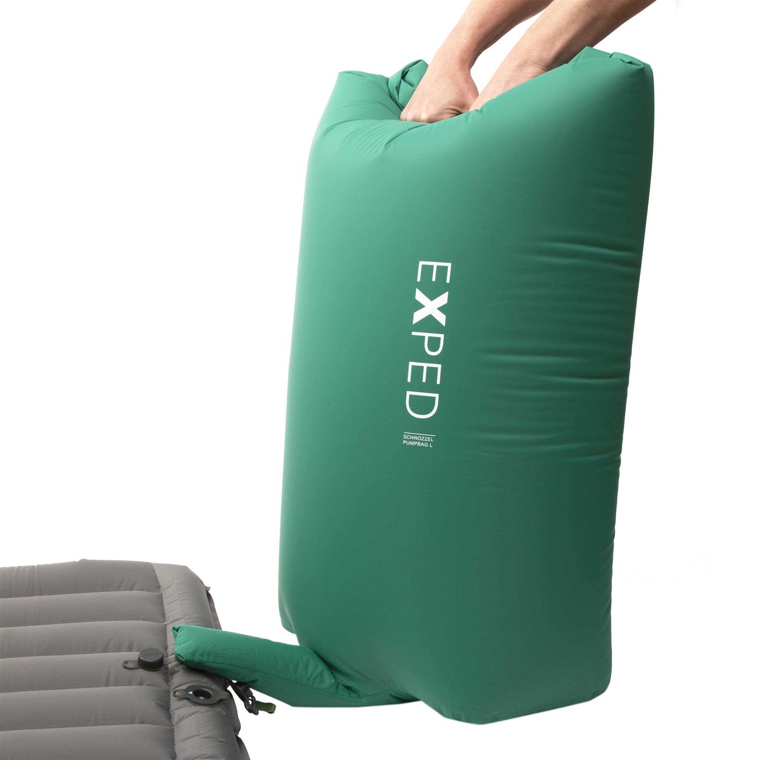 EXPED Schnozzel Pumpbag — Updated for 2023. The Schnozzel Pumpbag is a robust pump bag made of recycled material, ideal for a quick, moisture-free inflation of EXPED mats. In addition to its function as a pump bag, the Schnozzel Pumpbag can also be used as a waterproof compression pack sack for clothes or sleeping bags. When combined with the Universal Valve Adapter or the FlatValve Adapter, the Schnozzel Pumpbag can inflate almost any mat or inflatable.