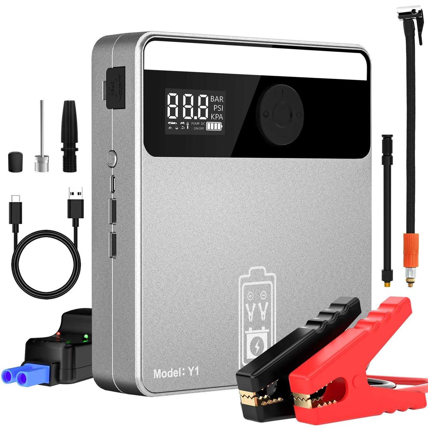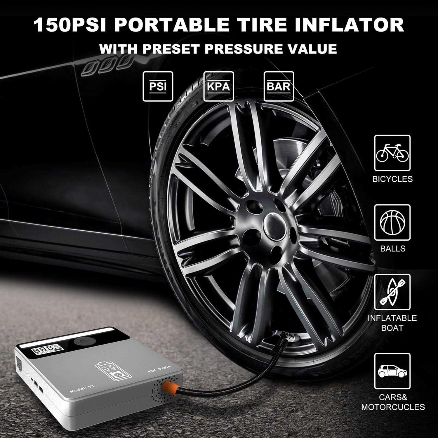 【POWERFUL JUMP STARTER】3000A peak current car jump starter can start 9L gas and 8.5L diesel engines quickly 【SMART AIR COMPRESSOR】The tire inflator is equipped with a tire pressure detection function. You can preset the desired value, and it will automatically shut off when the pressure is reached. It includes an air hose and 3 different nozzles for inflating cars, bicycles, balls, and other inflatable items. Note: The air hose may become hot after inflation, please wait a moment before removing it 【MULTIPLE PROTECTION】: The car jump box has 10 built-in safety protection technologies, which can easily and quickly start the car even in extreme environments (4°F to 140°F) 【EMERGENCY LIGHT & PORTABLE POWER BANK】: The lithium jump starter battery pack’s LED lights include three modes (Normal, Strobe, SOS), which can be used in different emergencies. it also can be used as a portable power bank to charge your digital products (such as mobile phones, computers and watches, etc.) 【ATTENTION】1: Please do not use the air pump function continuously for a long time. When the product heats up severely, please cool it down for a few minutes before continuing to use it. 2: If the jump starter is not used for a long time, please charge it once every three months. 3.