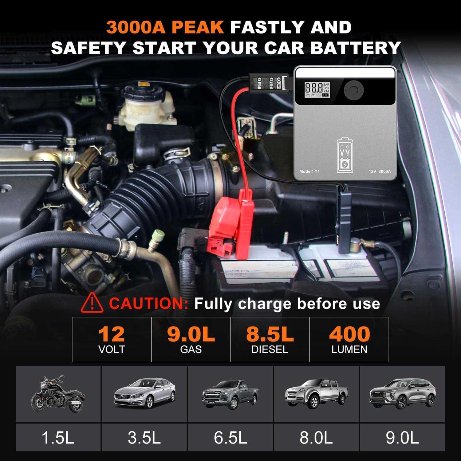 - 【POWERFUL JUMP STARTER】3000A peak current car jump starter can start 9L gas and 8.5L diesel engines quickly