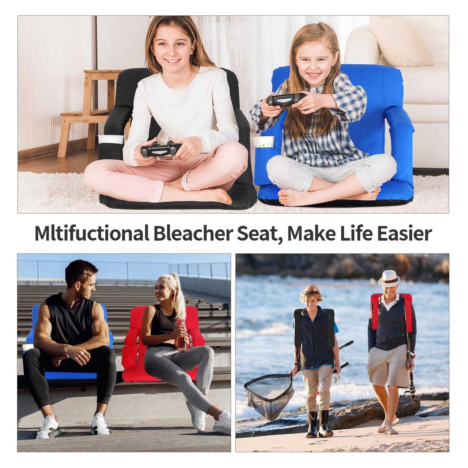 【Ideal Choice】 Perfect for all your needs, ideal choice for whatever camping, stadium, outdoor concerts, sporting events, beach; Made you feel comfortable instead of seating on hard bleachers 【Sturdy】 Made of 420D polyester covered cushion and sturdy steel frame with inner cotton stuffing; Water resistant PVC no-skid underside will let the seat always stay in place without slipping away 【Adjustable Position】 Enable to adjust to 5 different positions with integrated armrests provide maximum comfort to you; You can adjust the seat to your favourite and most comfortable angle 【Lightweight&Portable】 Only 7.27 lbs weight, adjustable and portable backrest and backpack easy to flat for storage or fold for sitting; Extra storage cup pocket for bottle of water or other things, the armrests’ front pockets can keep your valuables(cellphone, keys, wallet); A zipper pocket for storing extra accessories 【Dimension】 Overall dimensions: 18.8 “(L) x 15.7 “(W) x 20.4 “(H); Comfortable height setting–When the seat is opened, the back is 15.5 inches high, seat position is 16inches deep, the armrests are 8 inches from the top of the seat to the top of the armrest Features: br – You can adjust the seat to your favourite angle by 5 different reclining positions. br – Water resistant and no-skid bottom protect you without slipping away. br – Lightweight and portable backpack let you easy to carry and transport. br – Excellent choice for whatever outdoor or indoor usage, made you feel comfortable instead of seating on hard bleachers. br br Specifications: br – Color: Black / Red. br – Weight: Approx.7.27 lbs. br – Weight Capacity: Up to 280 lbs. br – Material: Steel + 420D Polyester + Cotton + PVC. br – Overall Dimensions: Approx.18.8 “(L) x 15.7 “(W) x 20.4 “(H). br