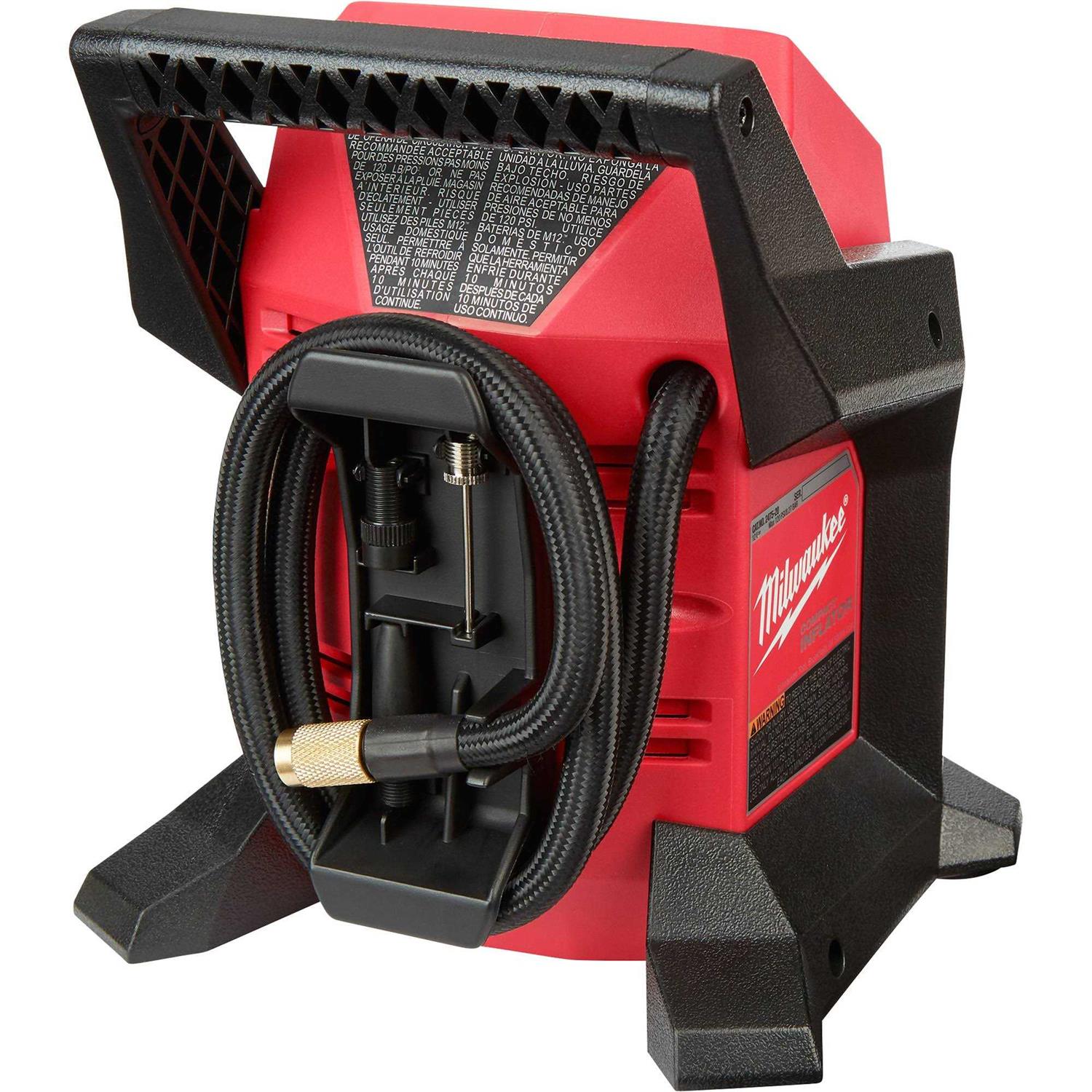 M12 compact inflator delivers fast, accurate, easy inflation with the portability to take anywhere. With the capability to complete demanding applications like car, LT truck, and compact equipment tires, the M12 compact inflator gives users ultimate power and efficiency. Rated to deliver over 120 psi (pounds per square inch), the high efficiency motor and pump top-off car tires in under one minute. TrueFill auto shut-off technology delivers highly accurate pressure, protects from overfill, and automatically senses speed of fill to deliver precise shut-off at the desired psi. Unit includes a large, easy to read back-lit LCD (liquid crystal display), anti-vibration feet, and 26 In. hose with an all brass Schrader chuck. Weather and impact resistant with a reinforced cage. Illuminated digital gauge with target and current pressure reading. Anti-vibration feet for no tool movement while running. Includes ball inflation needle, Presta chuck, Schrader chuck, inflator nozzle.