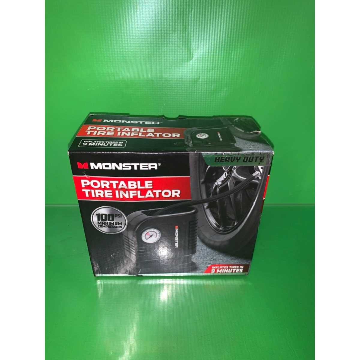 Quickly and easily inflate car and bike tires with this Monster inflator. The compact size comes with three inflation tips for handing all your filling needs. A flip power switch provides a 9 minute inflation time with up to 100 PSI.