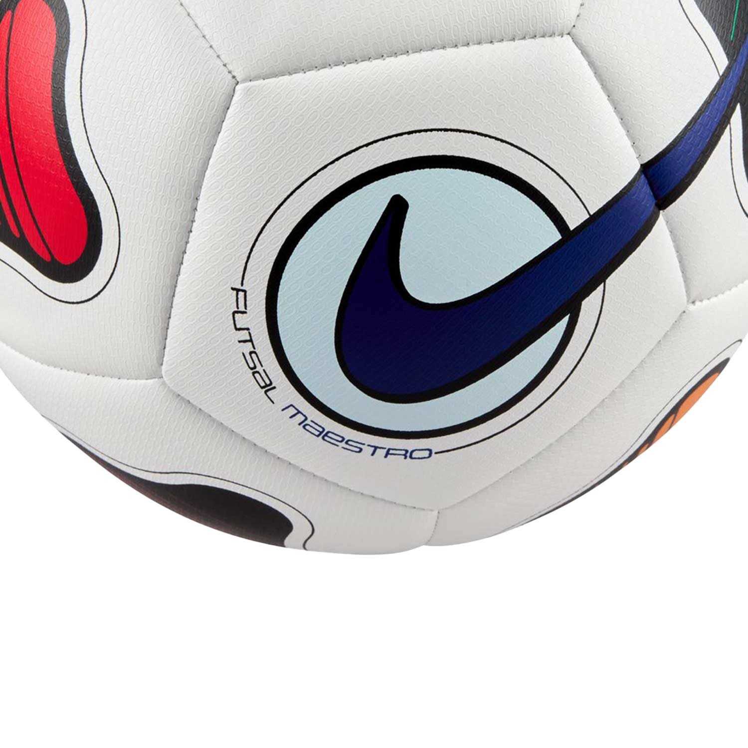 Nike SP24 Futsal Maestro Ball It’s game time. Easy to see, high-contrast graphics pair with a premium textured casing and a smaller, heavier design than outdoor versions to create the optimal ball for futsal play. Product Details High-contrast graphics help you easily track the ball. Machine-stitched casing optimizes shape, feel and durability. Textured casing has a consistent touch when passing, shooting and dribbling. 12-panel design provides true and accurate ball flight.