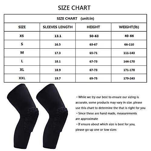 Ideal For Basketball/Skateboarding/Volleyball/Baseball/Softball/Tennis/Bowling/Cycling/Bicycling/Soccer/Football and more! Wash Tips Do not wash by machine! Use mild detergent and cold water hand washing. Do not bleach, do not wash in hot water. Don’t use dry cleaning or drying. Product Features Anti-Collision Design The front knee is equipped with a high-density PEF cellular gaskets. The high-abrasion resistance of the gasket and the gap can absorb most of the force at the moment of collision, effectively protecting the knee from severe impact damage. High Quality, Compression Technology High performance fabric will stretch over the knee, to help provide padding and support to the back and front areas of your knee. Compression technology helps to induce proper blood flow, which will not only promote circulation, but will also help in the healing process if you are suffering from an injury. UV Protection Cover your thighs, knees, and calves during athletic outdoor activities and prevent wrinkles, age spots, sunburns, skin damage, over-exposure from the sun and more! Anti Slip Grip Protection Elastic fiber will keep your knee in place, and the interior anti slip grip protection will help to keep the padded knee pad in place when you are moving quickly.Keep the knee warm, keep tight compression over the area, helps to promote quicker healing or recovery from injuries.