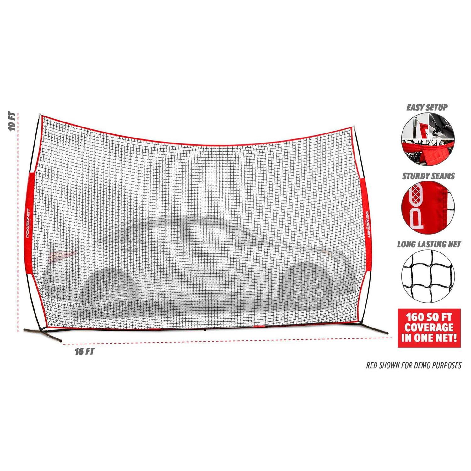 16 BY 10 BARRIER NET; This instant portable protection screen or backstop is great for any sport; Large bow style frame holds net secure and provides a large hitting surface or protective area; Perfect for baseball lacrosse basketball soccer field hockey softball and street hockey EASY QUICK SETUP / ULTRA PORTABLE; Net sets up in less than 3 minutes; No tools required; Includes ground stakes for added stability; Nets can withstand even the hardest hits or shots; Collapsible barrier nets assemble quickly and easily for stress-free setup; Lightweight for easy portability and movement around the field to different areas during practice sessions; Breaks down to fit in carrying bag for easy long-term storage and portability in almost any vehicle DURABLE; Our net is designed to take the abuse of the hardest hits throws and shots; The steel frame and flexible fiberglass bow poles provide a steady base for our knotless polyester net with PU coating TRAIN ANYWHERE / ANYTIME; Great for outdoor and indoor use; Perfect for protecting spectators and players, tee work, hitting, pitching, batting, fielding drills; Can be used for as a portable backstop for any sport indoor or outdoor; Perfect for training sessions or scrimmages; Great for any backyard, garage or on the field; Works for solo or team training INCLUDES; Net Frame Ground Stakes and Canvas Carry Bag ; Intended for ages greater than 12 years and older PowerNet’s Portable Barrier Net offers a large area for protection. Variety of uses includes home, field, and team practices anywhere you need to keep balls and errant shots behind a large protective screen. Our netting and frame system is made with our toughest heavy duty quality. This net is completely removable with hook and loop attachments at the base, allowing for easy setup and tear down.