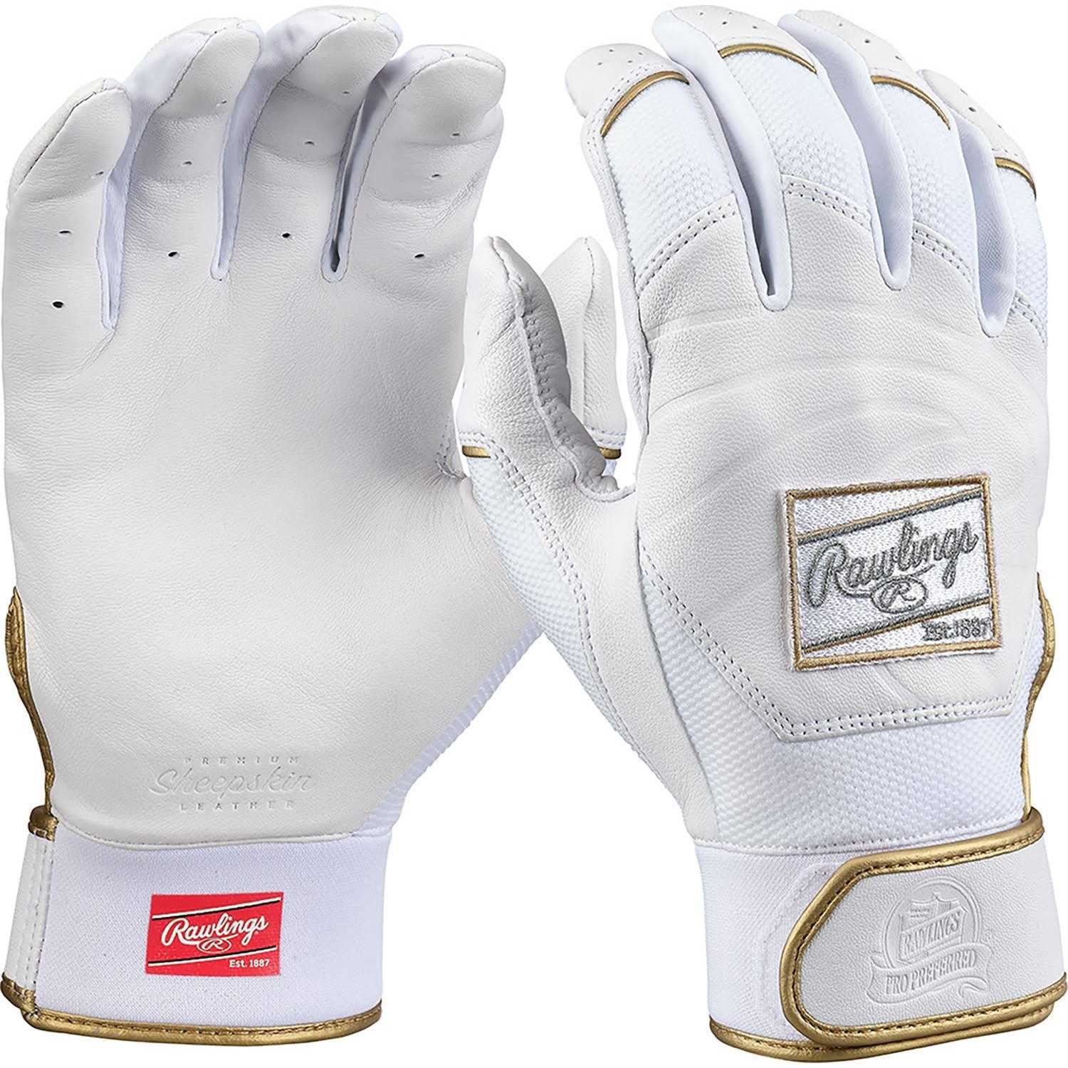 Unleash your potential at the plate with Rawlings Pro Preferred Batting Gloves, the ultimate choice for High School level players and above. These gloves feature professional-grade smooth Cabretta sheepskin leather, ensuring superior performance and durability across the palm, back, and strap.Experience unmatched comfort and a customized fit with the flexible neoprene wrist cuff, adorned with gold piping/binding for a touch of style. The double-stitched rolled edges enhance the gloves’ durability and deliver a professional finish that’s built to last. Sport the iconic design of the embossed Rawlings Patch logo and embossed Pro Preferred logo, showcasing your dedication to the game and your commitment to excellence.Choose from elite colorways, including Camel/Black/Gold, Black/Gold, or White/Gold, and make a statement on the field. Available in a wide range of sizes, from Adult S to XXL, Rawlings Pro Preferred Batting Gloves ensure every player finds their perfect fit. Take your swing to new heights and achieve greatness with these elite batting gloves.