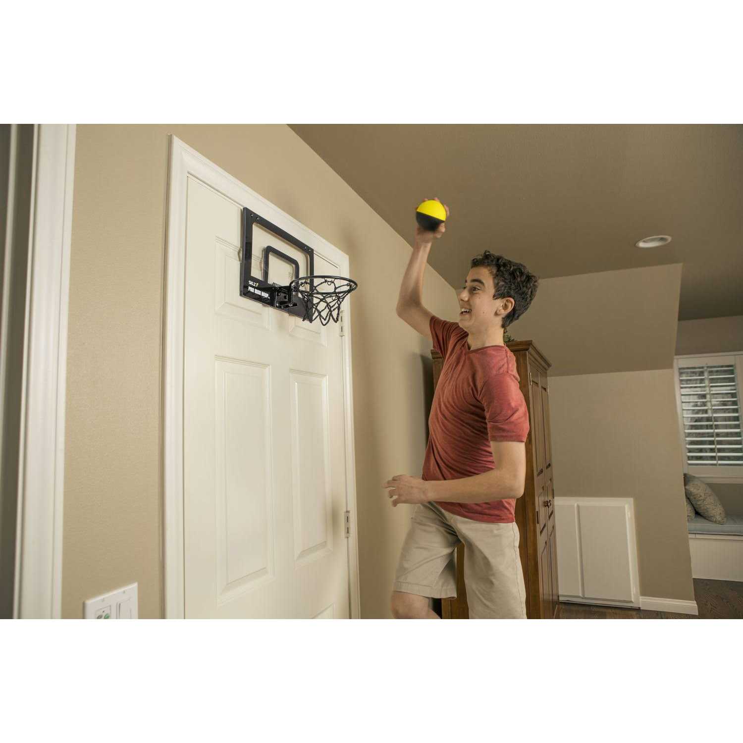 Ball anytime, near anywhere with SKLZ Pro Mini Basketball Hoop Micro. Its game on anytime with the quick assembly, easy mounting Pro Mini Hoop Micro. Anytime, anywhere you and your friends are ready to ball with the SKLZ Pro Mini Hoop. You can place this SKLZ Pro Mini Hoop on the back of almost any door in your home, office or even hotel room if you dont want to take a trip without a little basketball. There is padding backing on the back of the Mini Hoop to ensure the mounting of the door is protected meaning the only thing that will broken is your opponents spirit. With a break-away rim, clear shatterproof backboard, and foam mini-ball. There is everything you need wrapped up into one convenient mini kit. There is also a 3-ply net to make every shot have that beautiful swish. Be ready to ball at a moments notice with the SKLZ Pro Mini Basketball Hoop Micro.