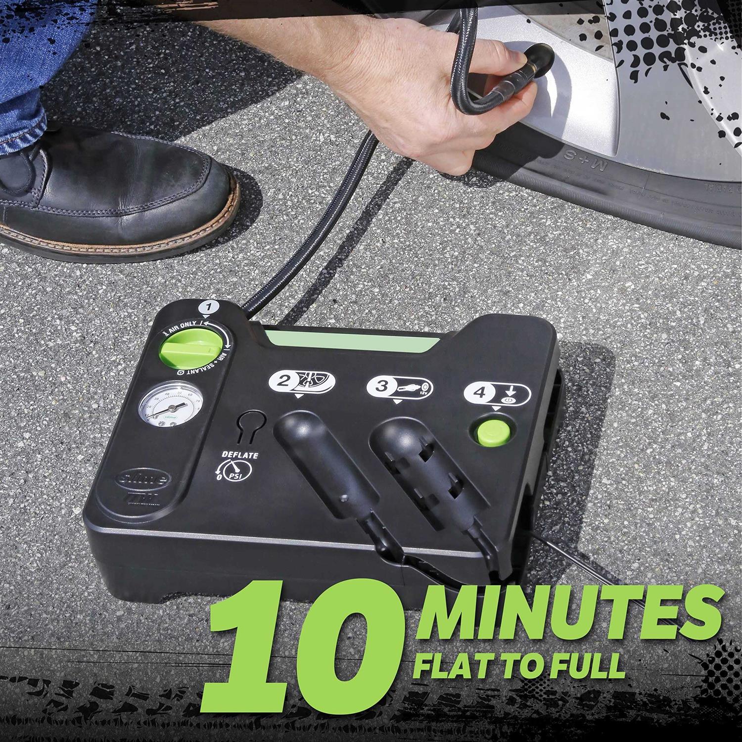 Fixing a roadside emergency flat tire can be a drag. Not only is it a dangerous job, it also takes time to change a flat tire. At least, until now. With the Slime Flat Tire Repair Kit, you will be up and back on the road in just 10 minutes. Slime simplified the traditional tire repair kit into four simple steps. It is that easy. Just plug the power connector into your 12-volt car accessory outlet and screw on the air hose, then push the button. Instantly, a mix of emergency repair tire sealant and air are fired right into your tires, sealing punctures and repairing the flat. Slime’s emergency tire sealant is tire sensor safe and approved by leading automakers. The Slime Flat Tire Repair Kit’s dial gauge (0-100 psi) is integrated right into the inflator, so you can monitor tire pressure as you inflate. If you get excited and put in too much air, you can easily take it out with the deflate button. Best of all, the temporary tire repair last up to 500 miles, more than enough to get you to a service station. With the Slime Flat Tire Repair Kit, you are not just buying time, you are buying safety and simplicity.