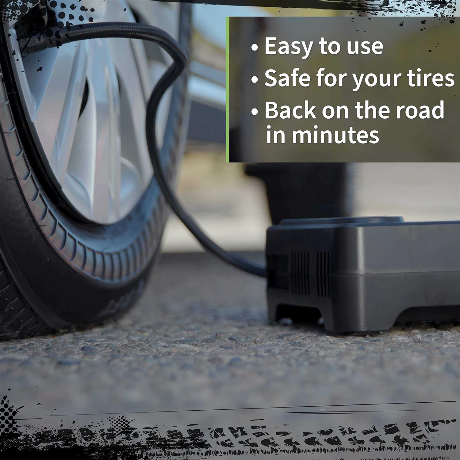 • Repairs and fully inflates your tire with the push of a button.