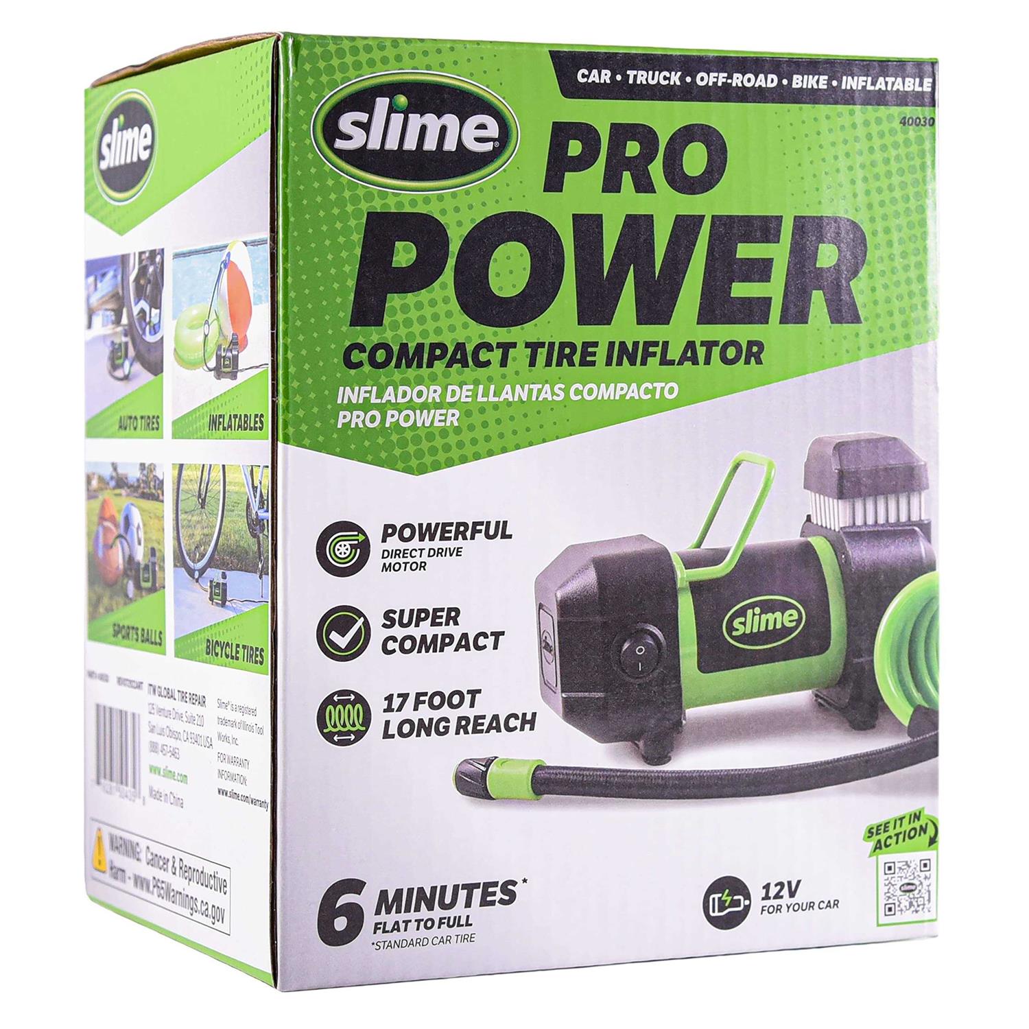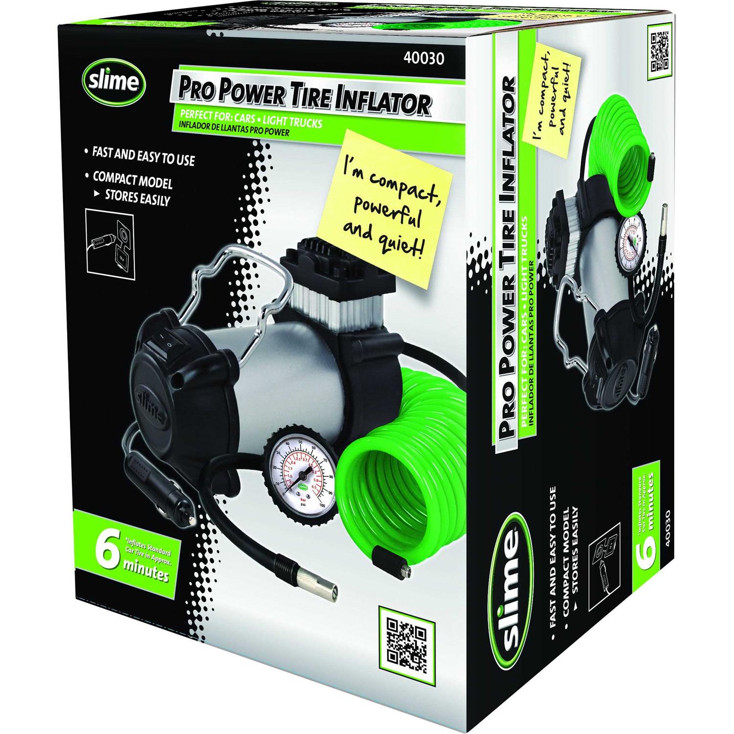 Slime’s Pro Power Tire Inflator includes a direct drive motor and thermal break feature to prevent the motor from overheating. Its powerful and compact design makes it the perfect inflator for cars and light trucks. With 12V accessory power, this inflator will inflate a standard car tire in 6 minutes. Features an on/off switch, 0-100 PSI in-line dial gauge, and hose adapter kit with two inflation nozzles and a ball needle. The air hose is 65 cm in length with a brass twist connector, and the green coil air hose is 213 cm in length and includes a brass disconnect with rubber insulated cover. This quiet and lightweight inflator has a 17-foot total reach. Specifications: .75 CFM; 10 to 15V.