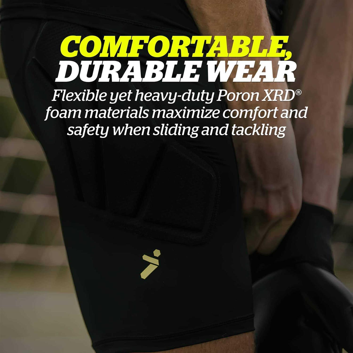 Goalkeeping sliding shorts made for maximum impact and abrasion coverage on the hips and tailbone. New design minimizes bunching a nd heightens flexibility. Protective against turf burn and play on hard surfaces. 10 mm molded thigh padding. Material absorbs up to 90% of impact. 3 mm stretchy Poron XRD tail bone padding. Lightweight materials wick away moisture for addit ional breathability. Anti-bacterial treatment reduces odors. Includes front pocket for athletic cup. Fabric 82/1 8 Nylon/Spandex Padding 100% Urethane Foam.