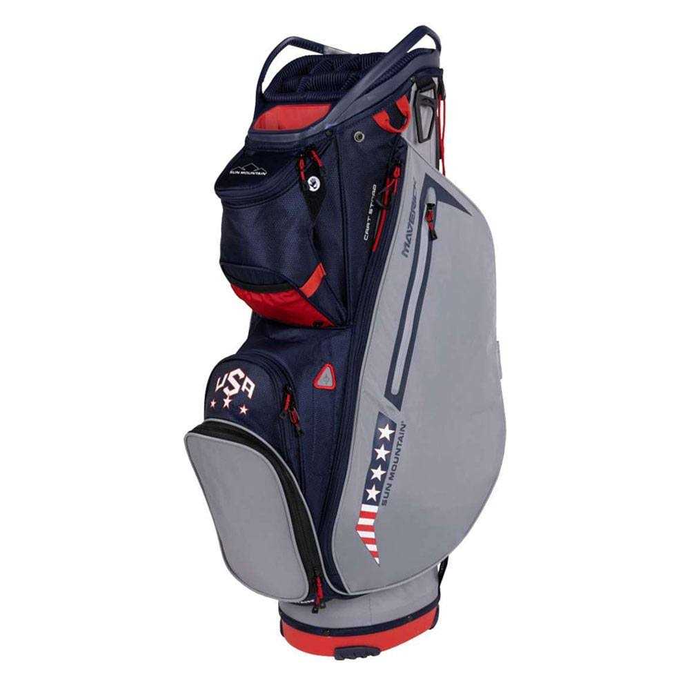 Sun Mountain Maverick 2023 Cart Bag The Maverick is a lightweight, full-featured riding cart bag. For convenience, all pockets are front-facing, so they are accessible when the bag is on a cart and the top has two integrated lift-assist handles for lifting the golf bag on and off the cart. The full-length, individual club dividers protect clubs and prevent the migration of club shafts. Weighs under six pounds. Fourteen individual dividers run the full length of the bag to organize and protect clubs. There are nine pockets, including a water-resistant, velour-lined valuables pocket, a vented cooler pocket, a sizeable apparel pocket and multiple accessory pockets. A cart strap pass-through runs behind the pockets so the bag can be secured to a cart without hindering pocket access. Cart bumpers for durability. Matching rainhood included.