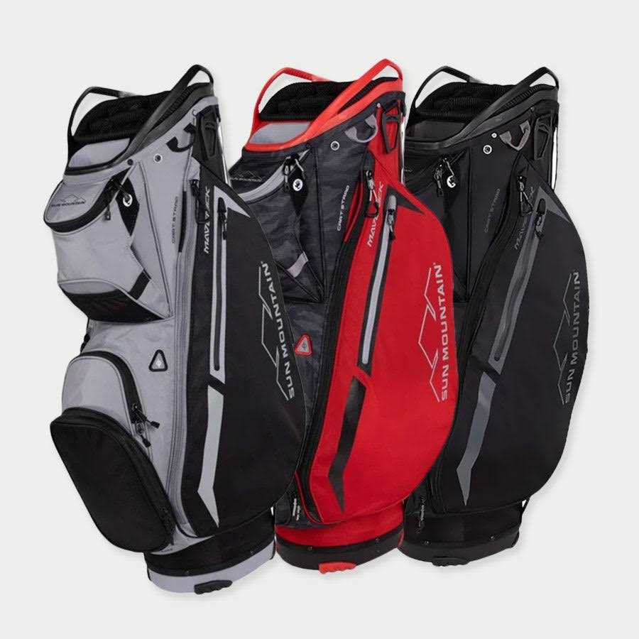 Sun Mountain Maverick 2023 Cart Bag The Maverick is a lightweight, full-featured riding cart bag. For convenience, all pockets are front-facing, so they are accessible when the bag is on a cart and the top has two integrated lift-assist handles for lifting the golf bag on and off the cart. The full-length, individual club dividers protect clubs and prevent the migration of club shafts. Weighs under six pounds. Fourteen individual dividers run the full length of the bag to organize and protect clubs. There are nine pockets, including a water-resistant, velour-lined valuables pocket, a vented cooler pocket, a sizeable apparel pocket and multiple accessory pockets. A cart strap pass-through runs behind the pockets so the bag can be secured to a cart without hindering pocket access. Cart bumpers for durability. Matching rainhood included.