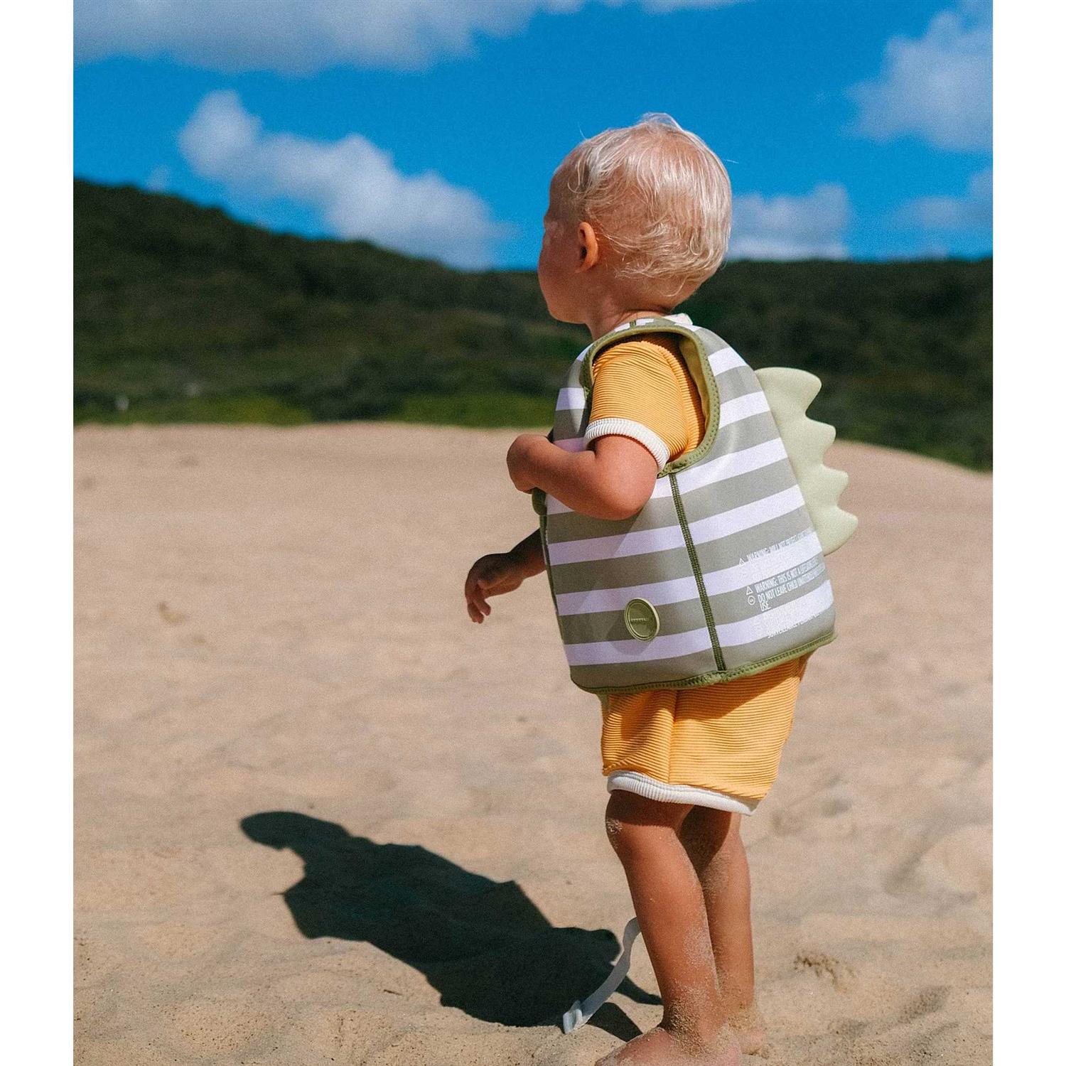 Green, white swim vest by SUNNYLiFE. The swim vest has a striped all-over print. It has foam inserts and a zip closure at the front. – Introduce your child to swimming. – Please note, sizes 1-2 and 2-3 have an adjustable safety strap between the legs.