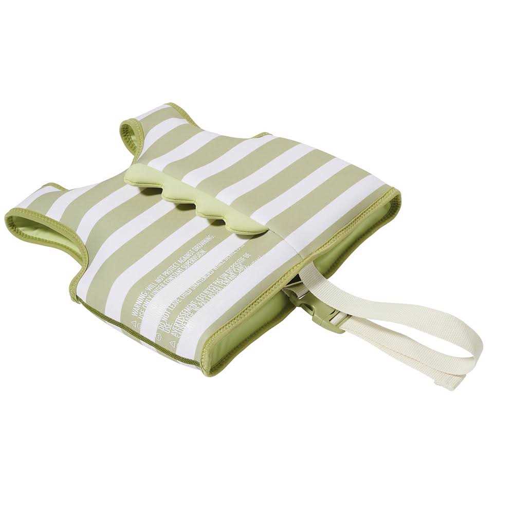Green, white swim vest by SUNNYLiFE. The swim vest has a striped all-over print. It has foam inserts and a zip closure at the front. – Introduce your child to swimming. – Please note, sizes 1-2 and 2-3 have an adjustable safety strap between the legs.