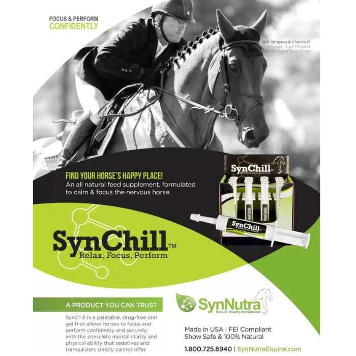 SynChill from SynNutra is a pleasant-tasting, all-natural equine calming gel meant to help your horse focus calmly on the job, whether that’s on the racetrack, in the show ring, out on the trails, or schooling at home. SynChill preserves your horse’s mental clarity, unlike sedatives and tranquilizers, while minimizing their ‘flight’ response. It’s also the only product on the market to incorporate 5-HTP (5-Hydroxytryptophan), a natural anti-represent and a precursor to serotonin. The unique blend of this amino acid, with Vitamin B6 and Melatonin, will maximize serotonin production and maintenance and allow for your horse to perform stress-free. You’ll love that this gel won’t take away from your horse’s physical capabilities, and with your partner’s improved mindset, you can maximize your ride!