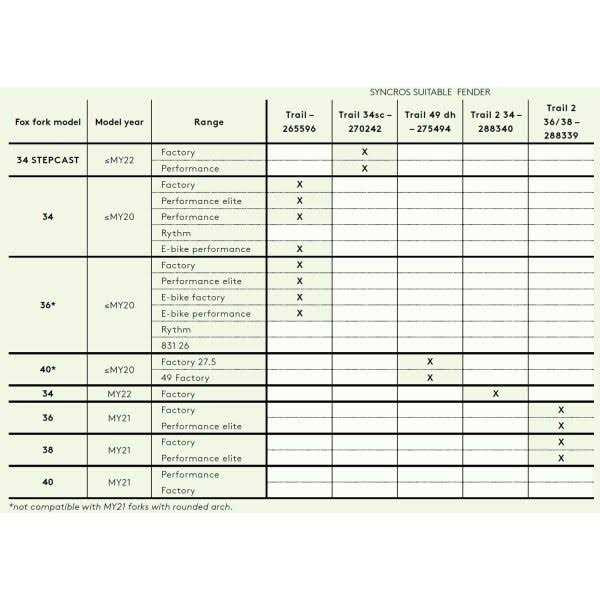 Syncros Trail fender is designed for Fox 34 Step Cast forks for the perfect fit on the fork arch using the included screws. Features Material: High impact resistant Polypropylene. Designed for FOX 34 Step Cast forks. Optimized fit through two screws on fork arch. Highest level of integration, durability and protection from mud. Mounted with 2 supplied Torx screws Tool included. Dimensions: 180 mm.