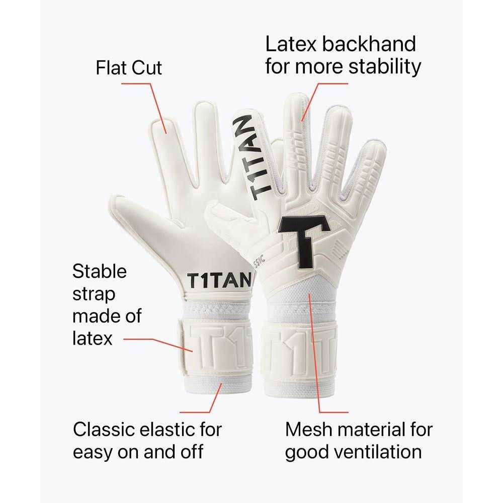 PERFORMANCE GOALKEEPER GLOVES FOR ALL SURFACES Inspired by our best Pro models: The CLASSIC 1.0 WHITE-OUT offers you strong grip and good abrasion resistance. This makes it the perfect T1TAN Glove for ambitious beginners and demanding junior players. HIGH QUALITY GRIP FOAM Strong grip in every situation: the high-performance 3mm + 5mm Classic Grip gives you strong grip and superior ball control. STRONG CATCH SECURITY Ready at any time: The proven Flat Cut makes catching even easier. You have more contact surface in every situation. EASY BOXING High-quality latex on the backhand ensures optimum ball control when boxing. Ideal for accurately punching any ball in the game. LESS SWEATING Breathable mesh inserts on the backhand and on the sides of the fingers provide very good ventilation. Optimal for long intense games in any weather. HIGH DURABILITY Special abrasion-resistant materials make the CLASSIC 1.0 WHITE-OUT the optimal companion for your training or game on all surfaces. EASY ENTRY The lightweight Easy Entry construction makes it a breeze to put on and take off the gloves. So you can get going at any time and show what you’ve got. COMFORTABLE AND LIGHTWEIGHT Thanks to the LATEX-ALLOVER construction, the glove is particularly light. For a pleasantly light wearing feeling in every situation. EVEN MORE CATCHING SURFACE Through the use of a latex bar, the T1TAN CLASSIC 1.0 WHITE-OUT offers you noticeably more catching surface and a great stability.