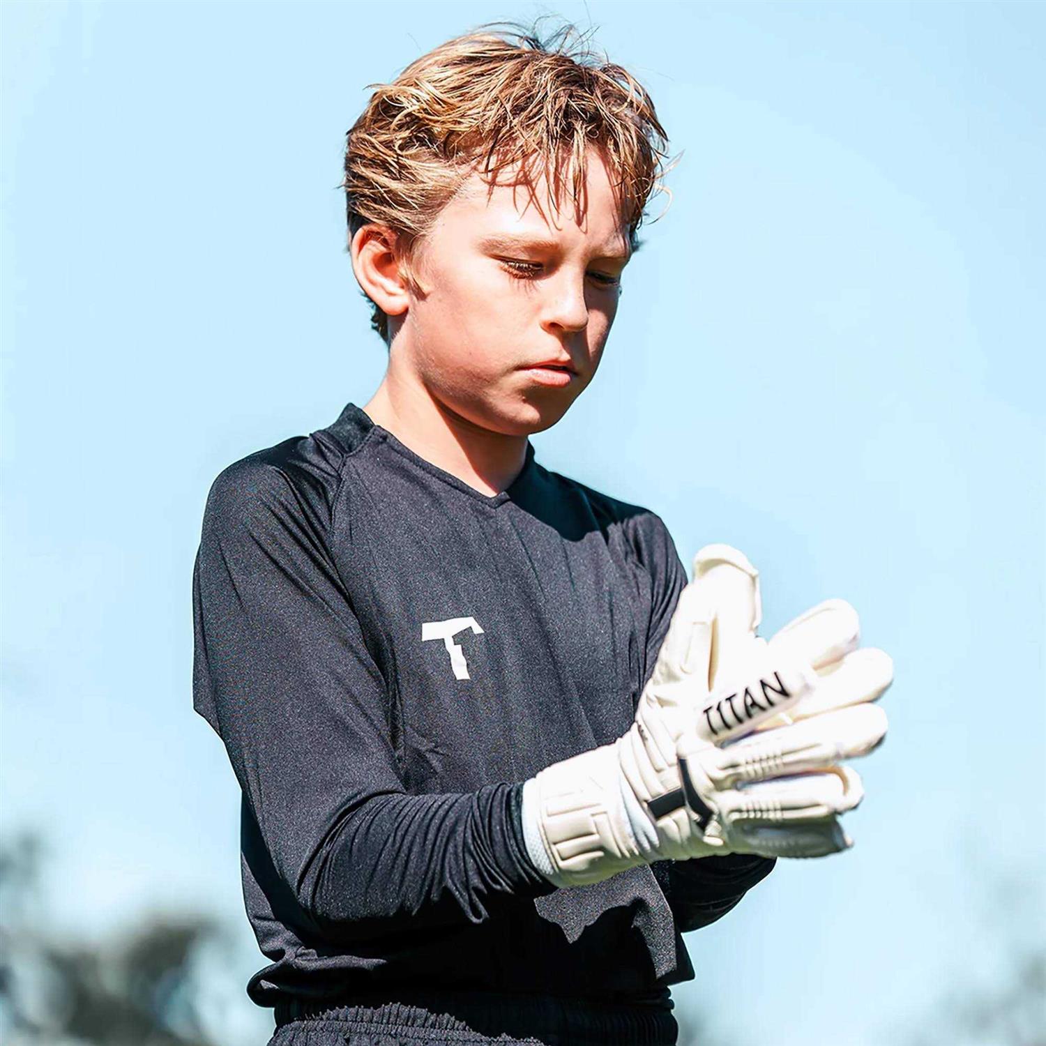 THE GLOVE FOR THE LITTLE UP-AND-COMING KEEPERS Today’s pros were young once, too: That’s why your kid should play with the right material. The CLASSIC 1.0 Junior has been specially designed for children’s hands. Top material for the next generation. Perfect fit, convincing grip and long durability. Our kids goalkeeper gloves are packed with great features. Durable Universal Grip. Makes your kid a power in goal: the special 3mm Universal Grip ensures a reliable grip. The high-quality adhesive foam is especially abrasion-resistant and durable. Comfortable and lightweight. Inspired by our top models, made for kids: thanks to a latex backhand the glove is comfortable and light at the same time. Optimal, for small children’s hands. Increased catching surface. Best chances to parry any ball: Thanks to seams on the outside, the catching surface is now particularly large. This makes catching balls successfully even easier. Punching Zone. More control for your child: The latex Punching Zone allows even more targeted punching. For even better cushioning, even during intense games. Stable Latex Strap. Through the use of a latex strap, the T1TAN CLASSIC 1.0 Junior noticeably has more catching surface and a lot of stability at the wrists. Made for any weather. The glove for every game. This model was developed for the demanding universal use. No matter whether it’s wet or dry: your child only needs this glove to be prepared for everything.