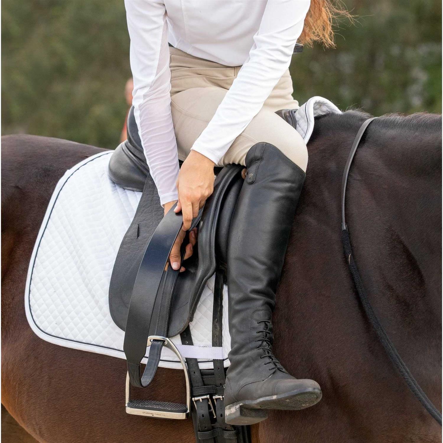 - Remaining portion is made from an ultra-thin nylon webbing wrapped in soft calfskin, which keeps the bulk under the saddle skirt to an absolute minimu