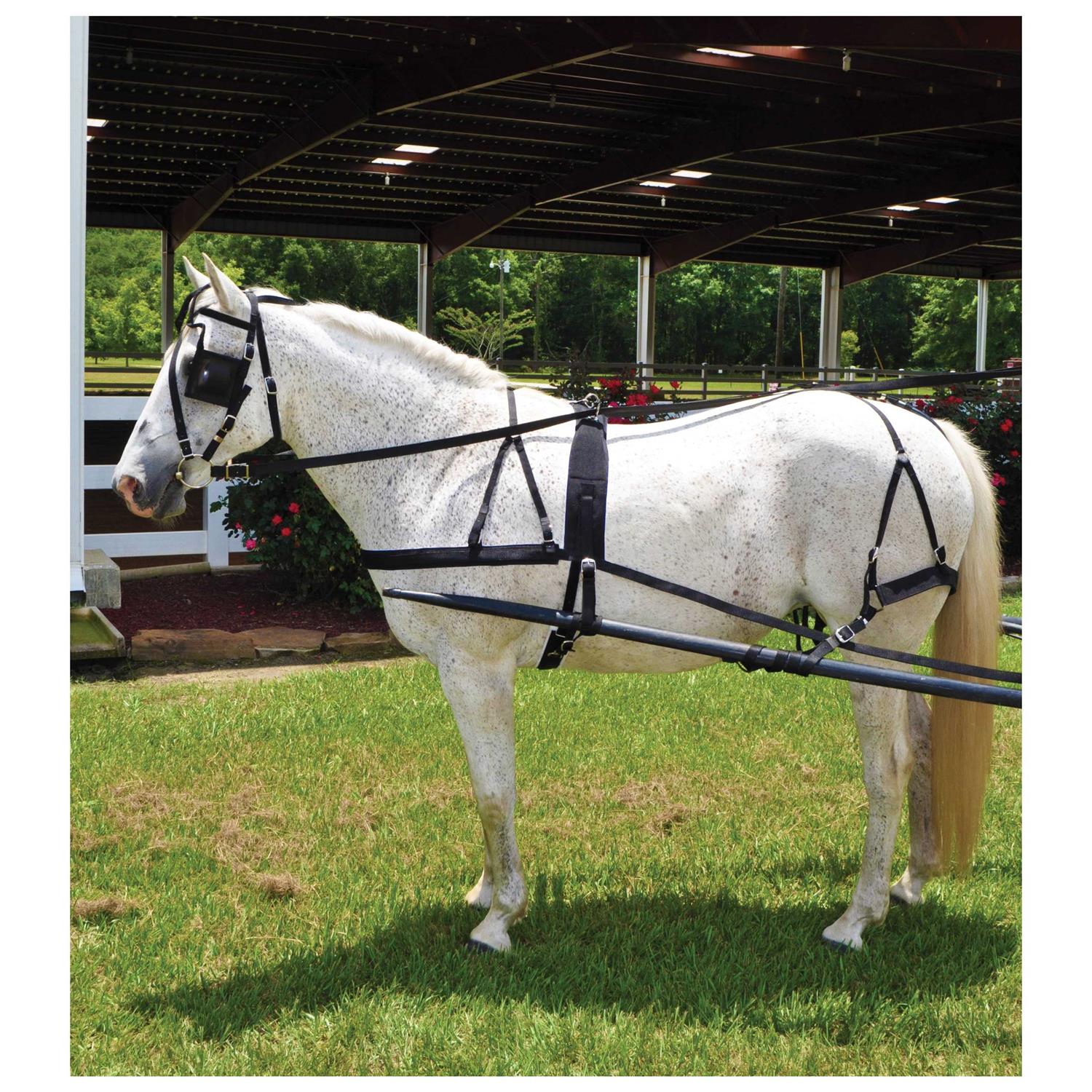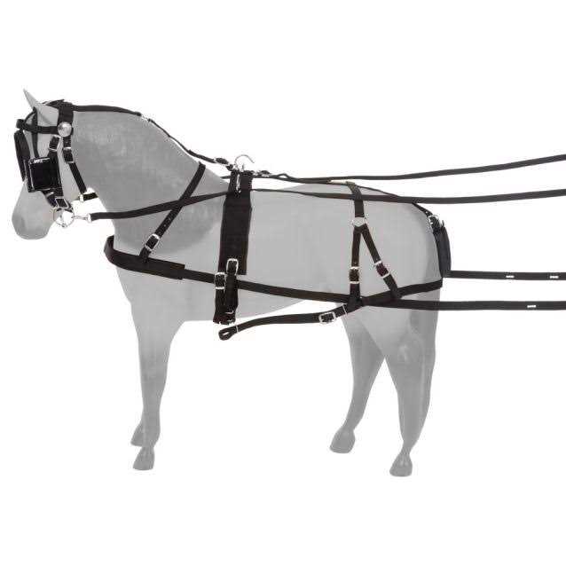A great starter harness that can take you from the practice ring to the show ring. Perfect for starting young horses with its’ durable, economical nylon design. A basic bridle with blinders and overcheck. Breastcollar style with fully adjustable surcingle.