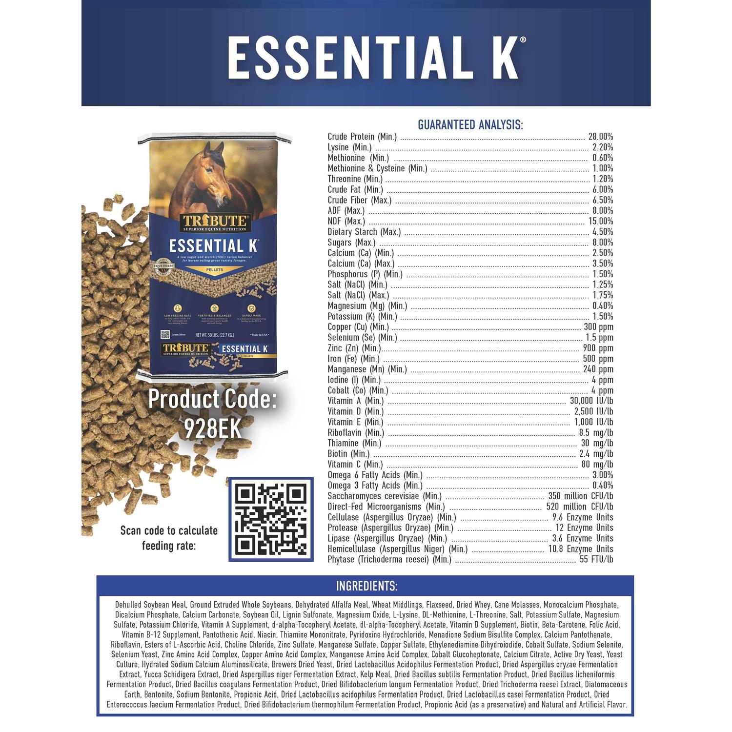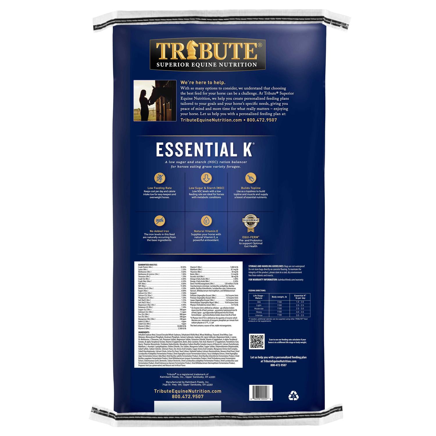 Nourish your equine friend with superior-quality nutrition by feeding her Tribute 50 lb Essential K Horse Feed! This pelleted horse feed is designed and approved by Ph.D. Equine Nutritionists to balance rations for idle, growing and performance horses.