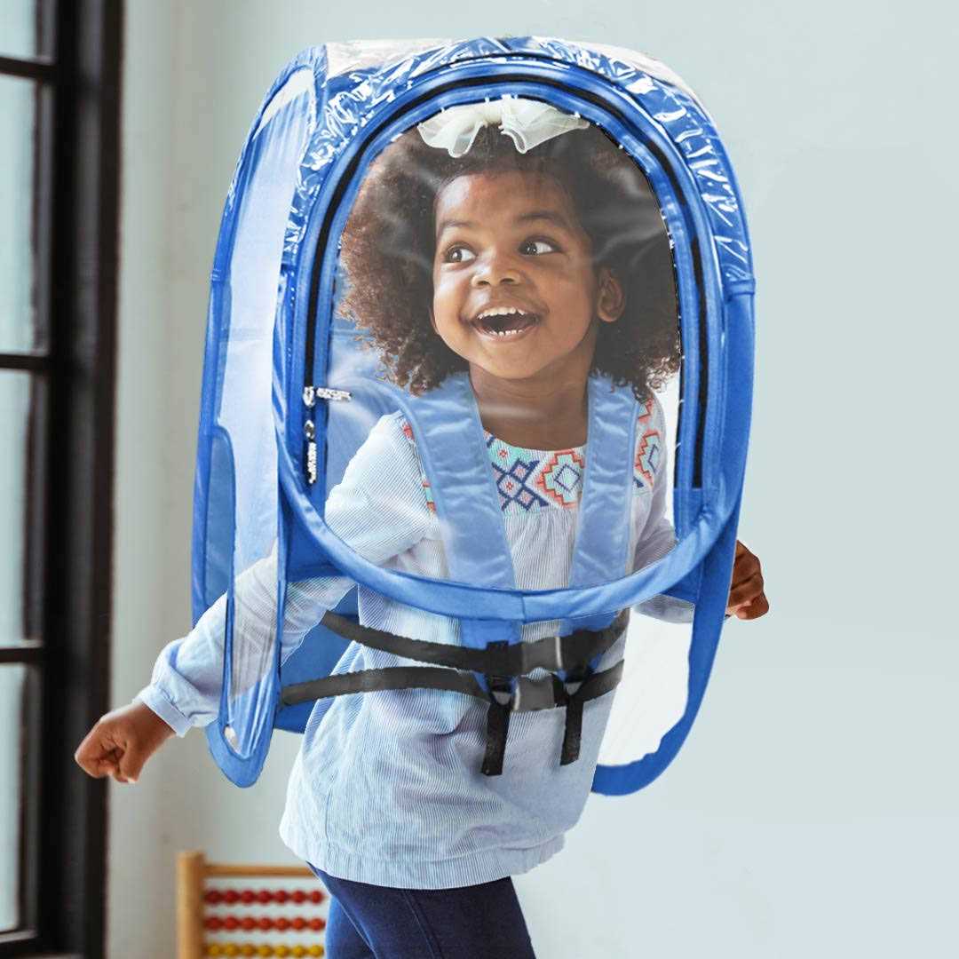 Slim profile and super-lightweight Flexible, clear panels on three sides and roof Designed for ease of movement Spacious armholes, raised front panel and open bottom for easy use Quick and easy to pop open and slip easily over upper body Introducing Under the Weather’s new ShieldPod! This lightweight protective barrier pops open in seconds for added peace of mind while you’re out and about or on the job. And while it’s designed for inside use, it can be worn outside but isn’t weatherproof. The adjustable backpack and waist straps keep the Pod in place. The clear panels give a 270° view of your surroundings. Spacious armholes and raised, zippered front offer full range of movement. The uses are endless—the classroom, public transportation, work stations, family outings or celebrations, visits to grandparents, car pools, day care, and more.