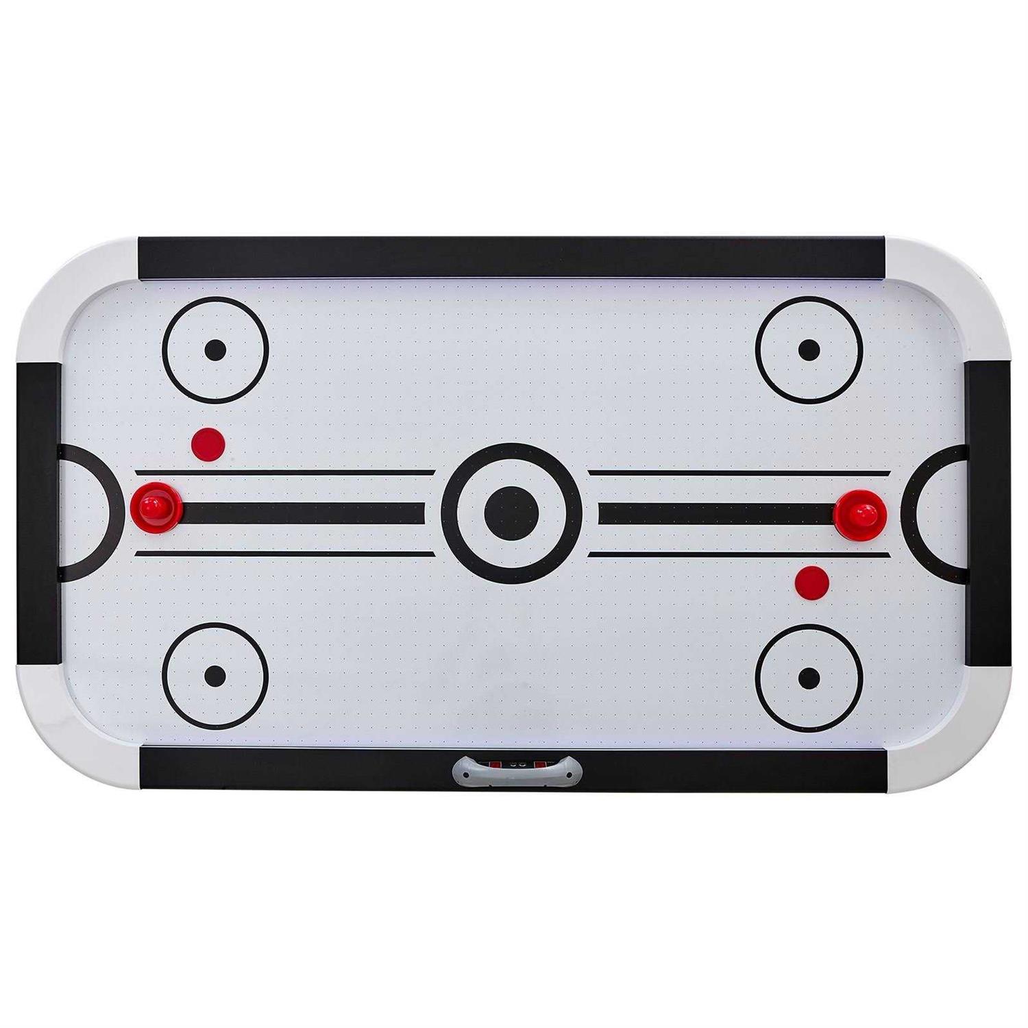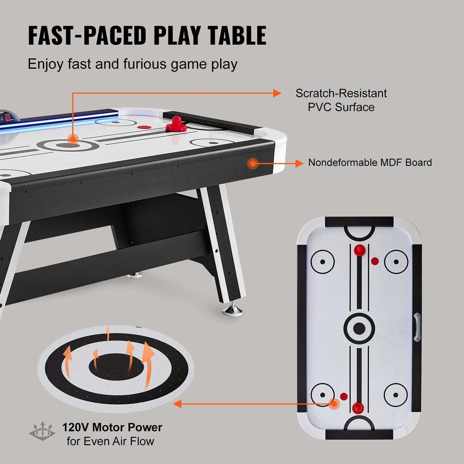 VEVOR 【LED Air-Powered Hockey Table】 This air hockey table shines bright with its built-in LED light strips, offering a vibrant and immersive playing atmosphere. Designed for a 4-player match, the table’s glow intensifies the game experience, especially when room lights are dimmed, amplifying the thrill of the play.