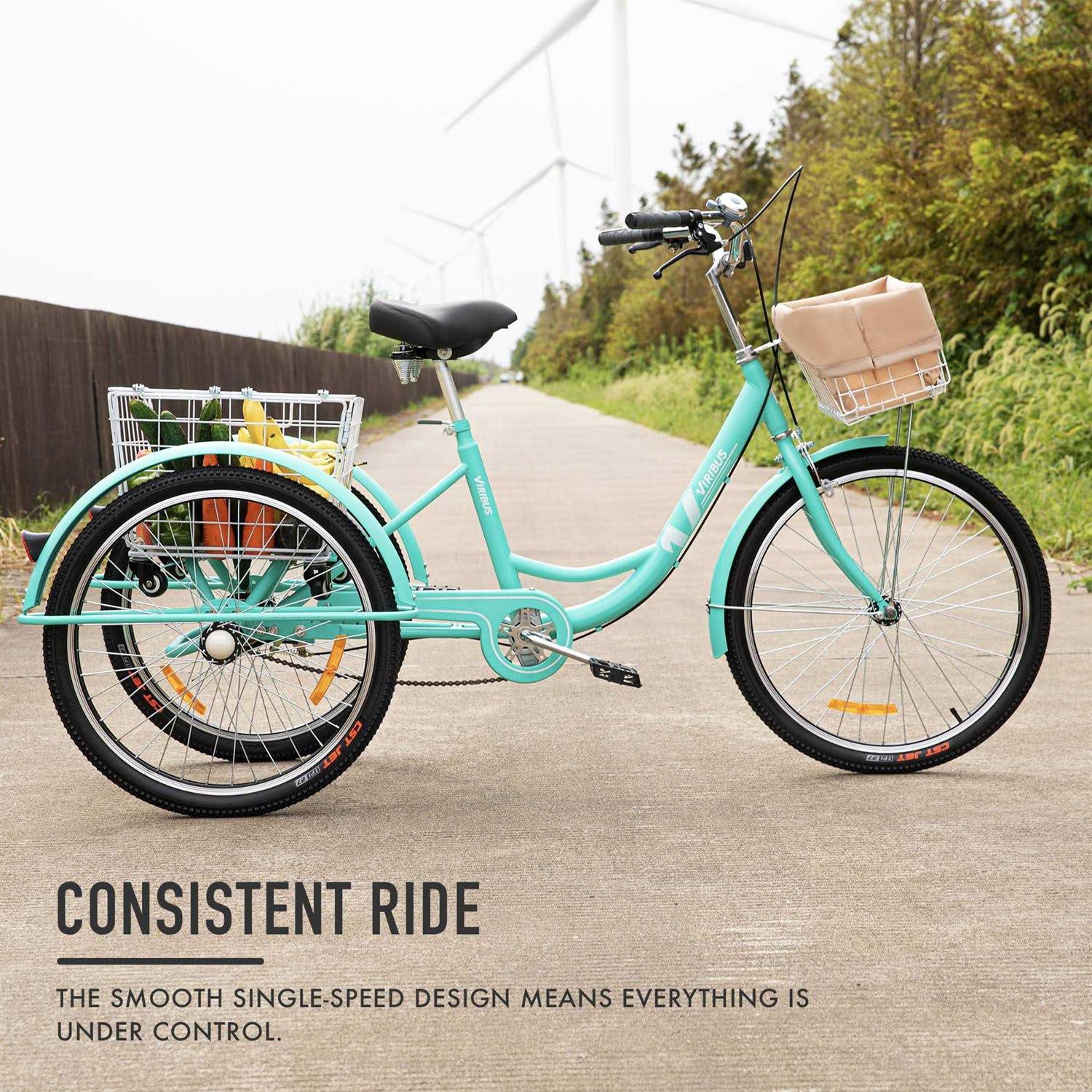 Viribus 24 inch Single Speed Adult Tricycle,3 Wheel Cruiser Bike with Removable Basket, Lights & Bell,Mint Green