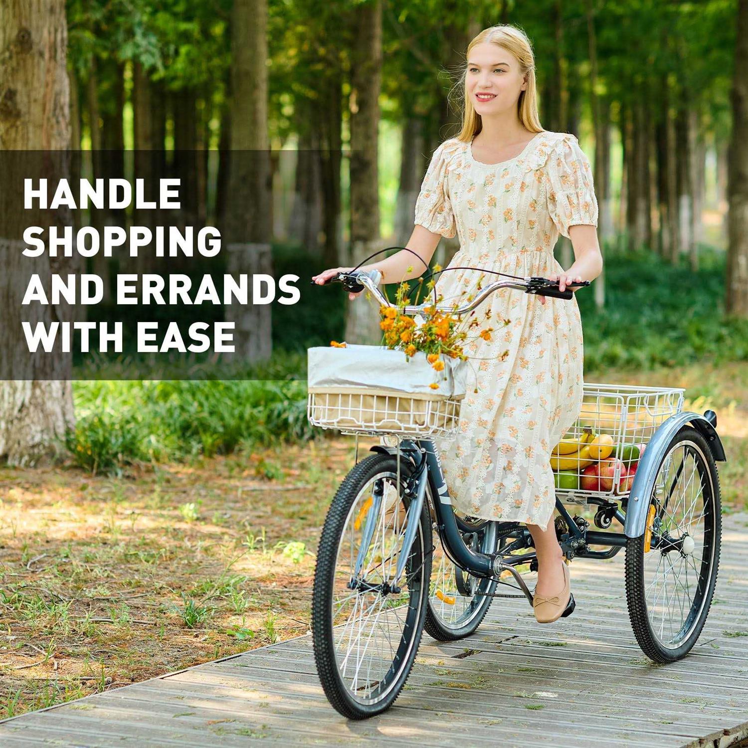 Hit the road on this adult tricycle! The carbon steel frame is protected with an anticorrosive finish; the high-quality 7 speed Shimano derailleur lets you adapt to rough terrain, inclines, and other difficulties; the wide adjustable padded saddle softens any bumps in the road; the front & rear brakes provide powerful control even on slopes; and the durable rubber tires provide a stable grip and sure handling that last for years. Enjoy mobile storage with the front and rear cargo baskets that offer 55 and 110 pounds of capacity while providing 0.5 and 2.8 cubic feet of space. Our trike’s adjustable handlebars and seat provide a customized ride that leaves competitors in the dust.. · STURDY & BALANCED TRICYCLE: This adult tricycle’s high carbon steel frame offers lightweight stability and support for riders up to 450 pounds; this trike has heat treated varnish to ensure years of corrosion free performance. · 7 CONVENIENT SPEEDS: This three wheeler’s premium Shimano derailleur provides smooth shifting through 7 gears to minimize your pedaling on straightaways and give you extra traction on hills and inclines. · SUPERIOR COMFORT: Our cruiser bike has three 24 inch premium rubber tires for excellent traction while the wide padded faux leather saddle softens any bumps on the road; both the bike seat and handlebar are adjustable to meet your exact needs. · SPACIOUS BASKETS: Your new adult trike comes with front and rear cargo baskets that offer ample storage to transport groceries, office supplies, or weekend picnic essentials; a handy canvas bag also comes included to keep loose items together. · DEPENDABLE SAFETY: Ride safely at high speeds and go on any path without fear thanks to the low step-through frame, extra large saddle, and wide wheels; start enjoying great cycling in greater comfort and safety today!. Material: Carbon Steel, Artificial Leather, Rubber. Color: Matte Gray. Overall Length: 69.2 in. (175.8 cm). Overall Width: 27.1 in. (68.8 cm). Wheel Diameter: 24 in. (60 cm). Tire Width: 2 in. (5 cm). Seat Length: 10.2 in. (26 cm). Seat Width: 9 in. (22.9 cm). Seat Height Range: 32.7-36.2 in. (83-92 cm). Handlebar Height Range: 39.8-43.3 in. (101-110 cm). Rear Basket Dimensions: 21.3 x 16.5 x 14 in. (54x42x36 cm). Front Basket Dimensions: 12 x 8.7 x 9 in. (33x22x23 cm). Front Basket Capacity: 55 lb. (25 kg). Rear Basket Capacity: 110 lb. (50 kg). Overall Capacity: 450 lb. (205 kg). Suggested Rider Height Range: 61-69 in. (155-175 cm). Net Weight: 64 lb. (29 kg). 1 x Adult Tricycle. 1 x Canvas Bag. 1 x Lock. 1 x Installation Tool Kit. 1 x Instruction Manual
