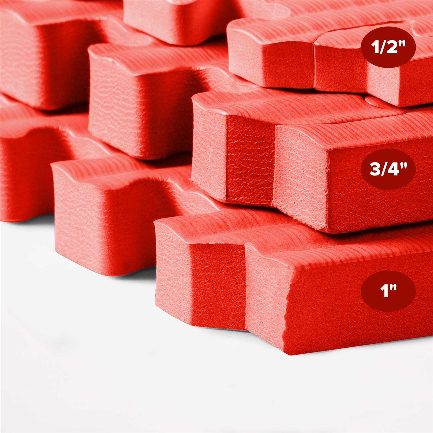 The superior thickness of the 34 inch series makes it an economical choice for more than just martial arts – it’s perfect for a sophisticated home gym space, ideal for yoga, pilates, and bodyweight exercises such as push-ups, sit-ups, crunches, burpees, planks, squats, and lunges. Not recommended for high-intensity, high-impact, or weight-bearing exercises. Interlocking tiles should not be installed over carpet, and you may wish to use double-sided flooring tape for any semi-permanent installation. EVA foam is a soft product and will indent under furniture or heavy objects. It is subject to puncture and can be damaged by pets. EVA foam is easily trimmed with a sharp knife or scissors, so you can measure your space and cut tiles to fit for a snug wall-to-wall installation. Please note that colors are subject to minor production variations and may fade over time. Extended exposure to direct sunlight may cause the colors to fade more rapidly.